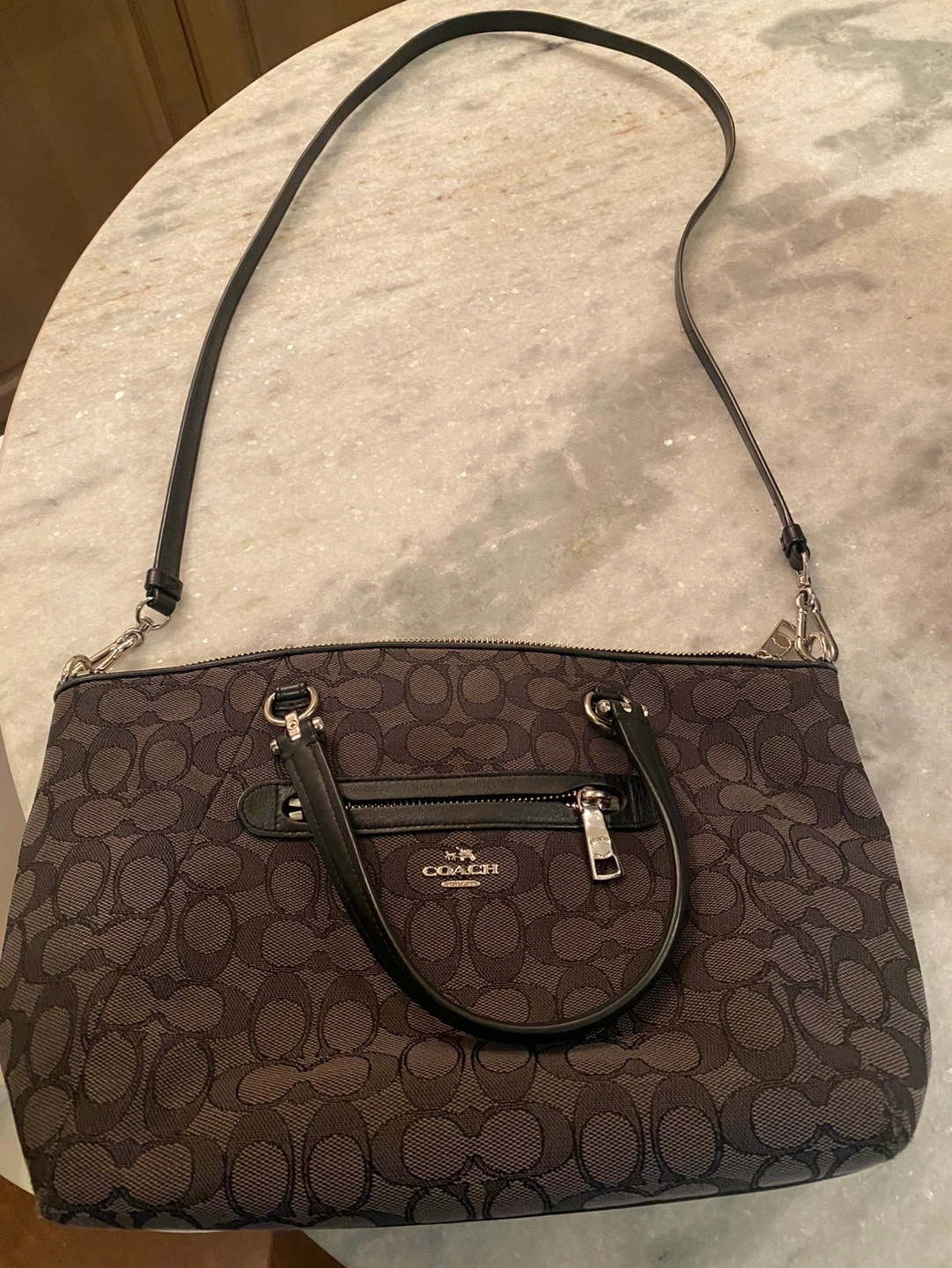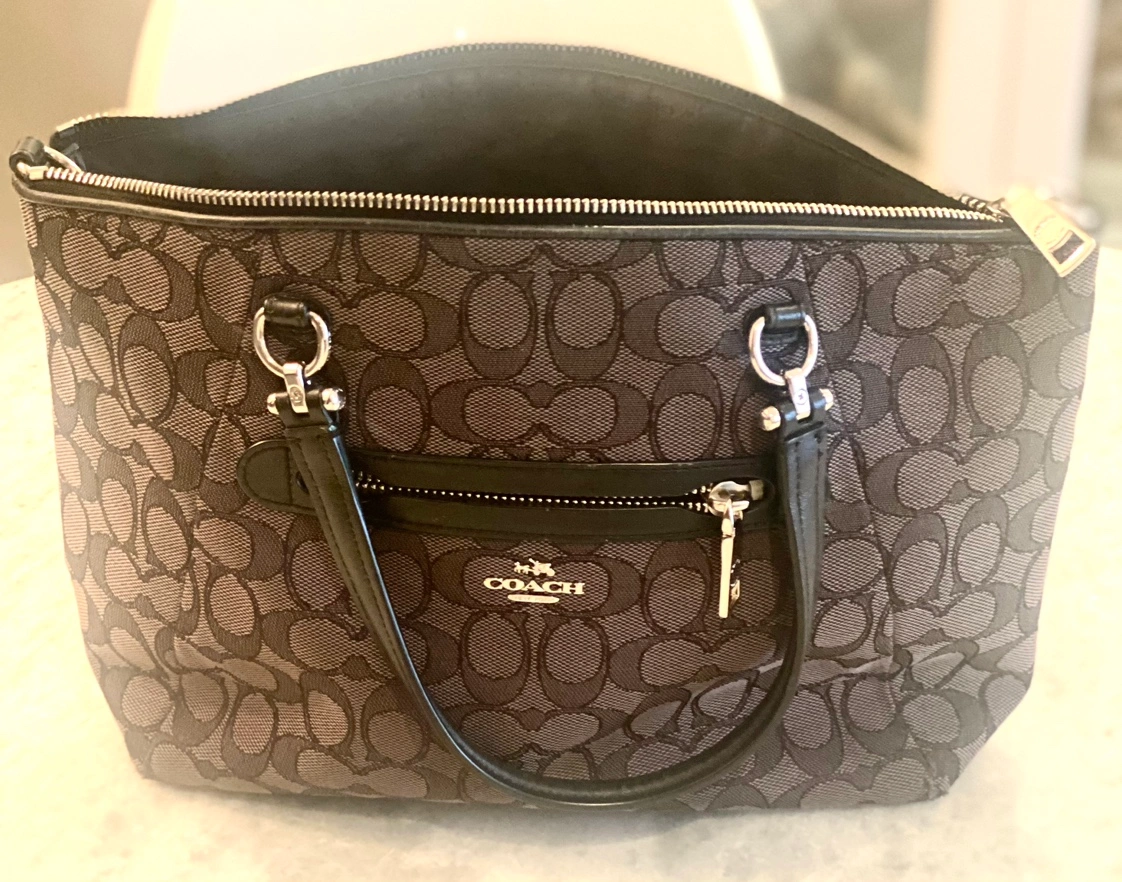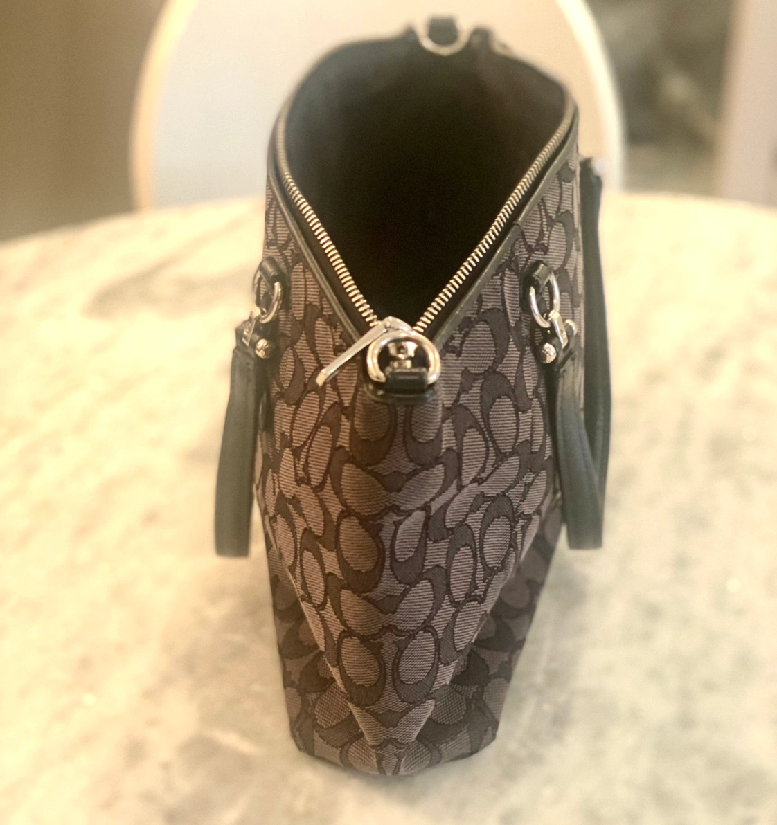 A classic Coach tote bag in the signature pattern, featuring black leather accents and a zip closure.