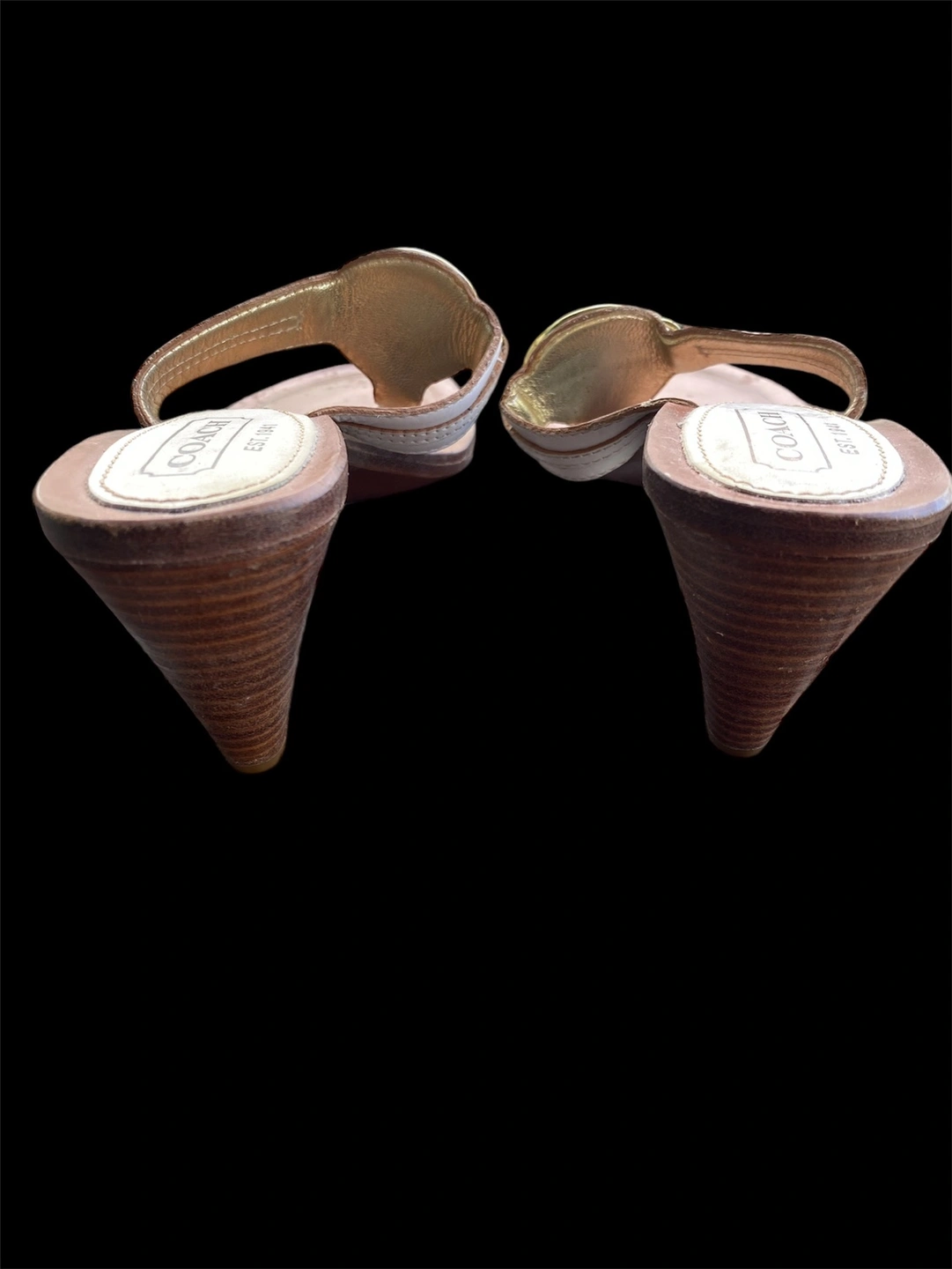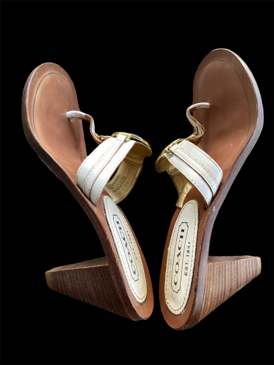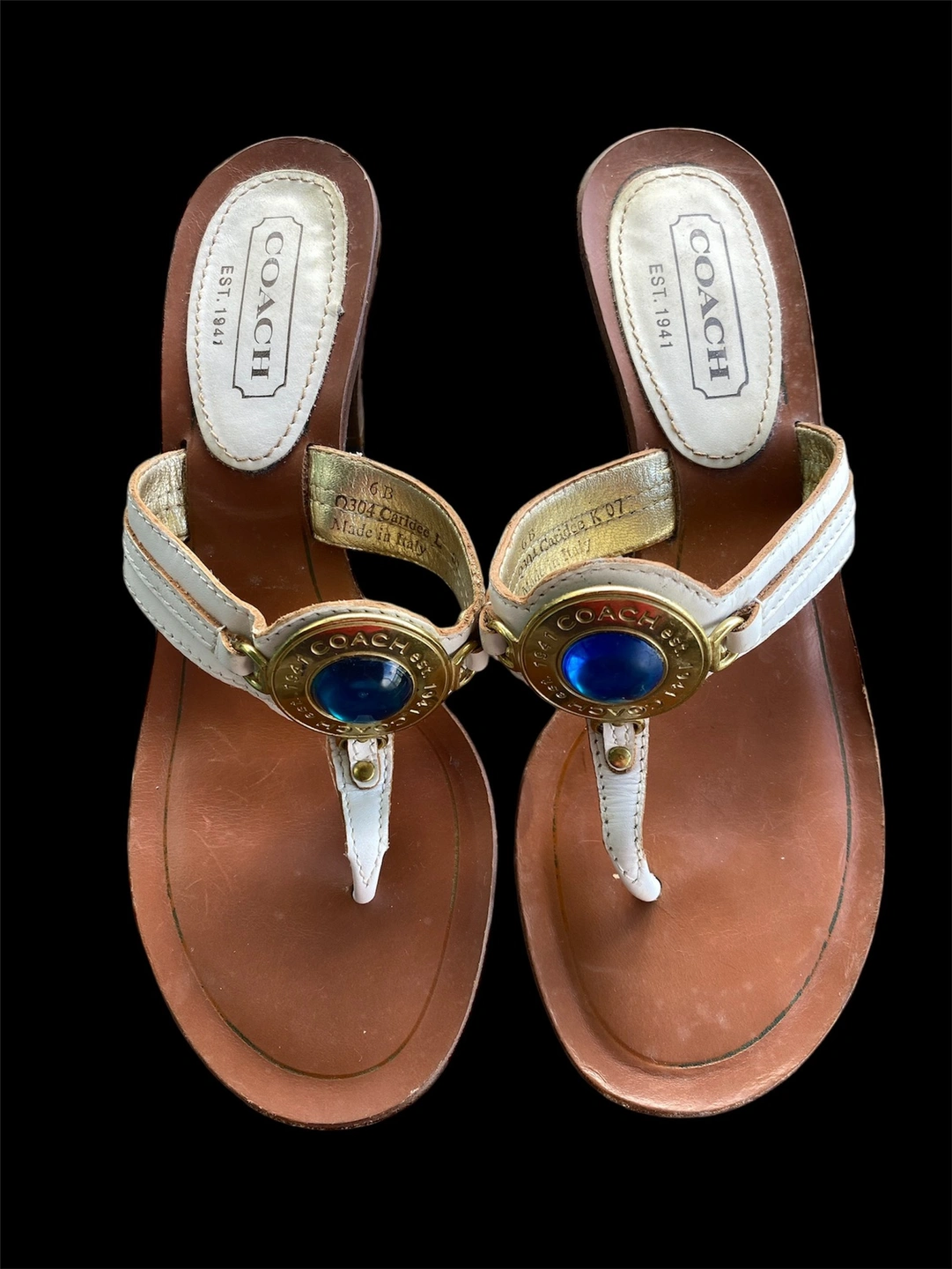 White leather Coach sandals with a blue stone accent, gold hardware, and a wooden heel. These sandals are a size 6.