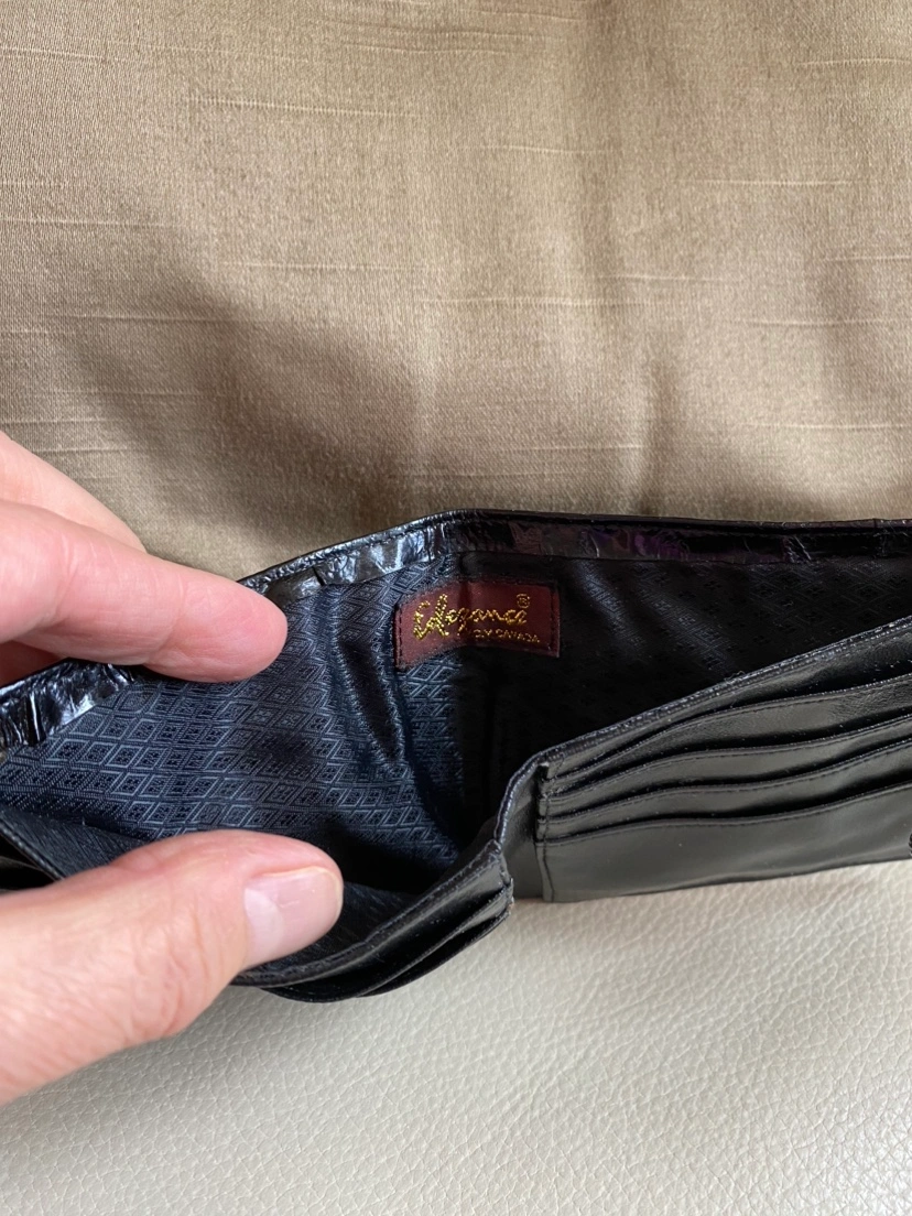 Black leather wallet with a snap closure and zippered compartment. This wallet has multiple card slots, one billfold slot, and one zippered coin pocket. It measures 12 cm wide x 9 cm high. It is made of real leather by a Canadian company called Elegance. I have posted it under the men’s section but it can be for a woman too! From a pet and smoke free home. Pickup only in the St. Lawrence market area of downtown Toronto. Cash only.