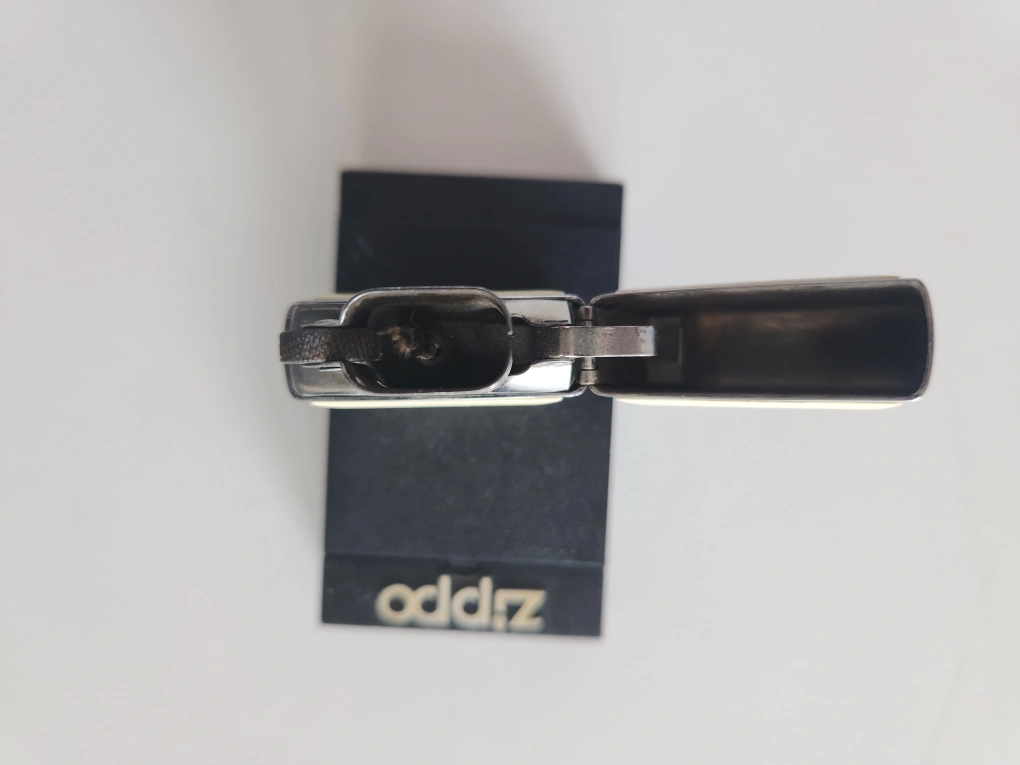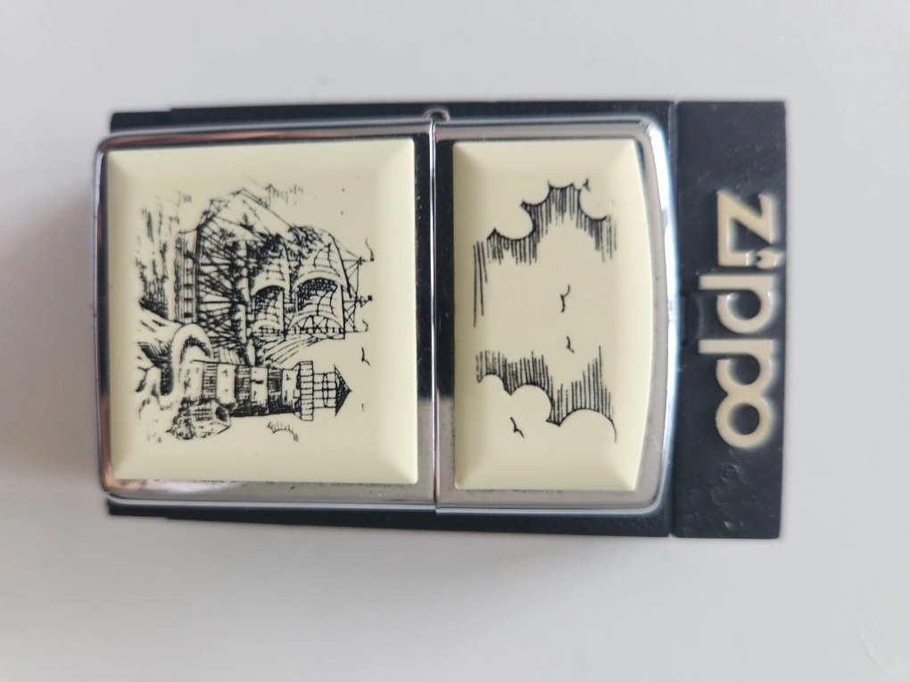 Used Vintage Zippo lighter with a black and white lighthouse design and original case.
