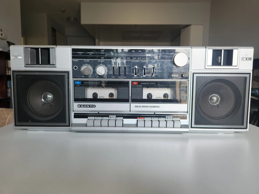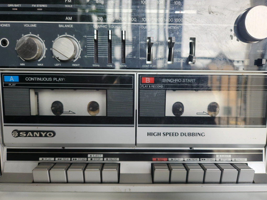 547Vintage Sanyo Boombox stereo system with double cassette decks, AM/FM radio, and high speed dubbing.