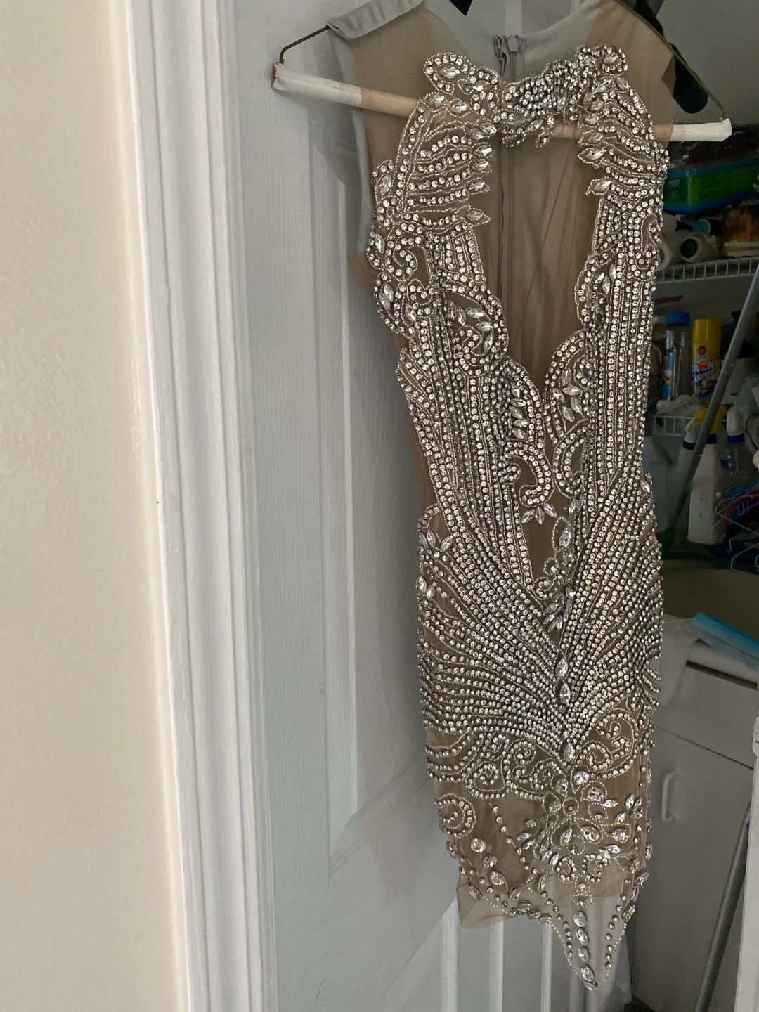 A beautiful, sparkly, nude dress with a sheer bodice and beaded detail throughout. This is a perfect dress for a night out. It is a little tight and has a built-in bra. I have included a full-length picture of the dress.