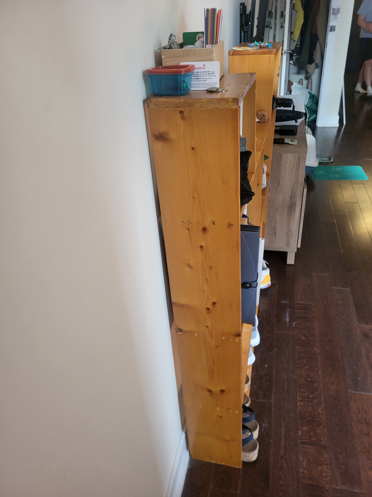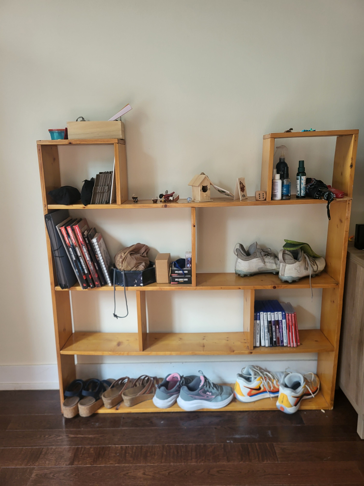 A wooden bookshelf with open shelving. bought second hand a couple months ago. getting rid of it as we are moving. a little wobble but a nice piece for storing bits.