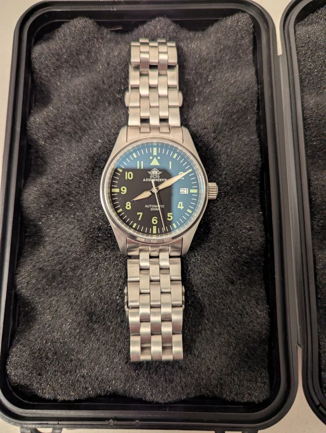 Addiesdive NH35 automatic movement dive watch. All stainless steel construction with 200m water resistance. Includes original protective case.