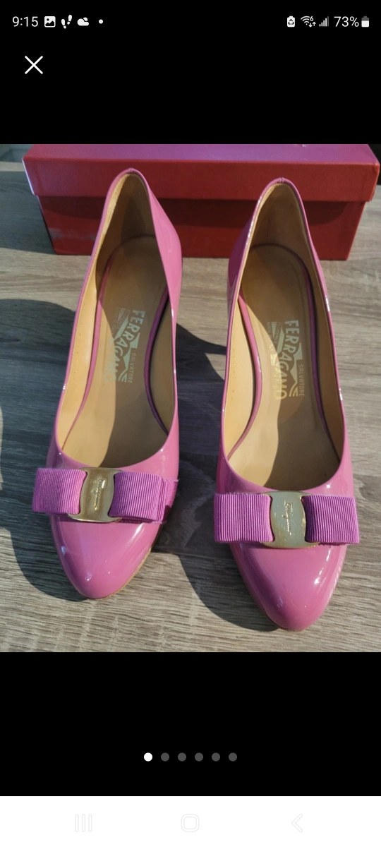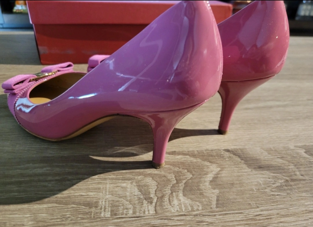 Pink patent leather heels(7cm) with a gold bow detail. The shoes are in good condition and come with their original box.