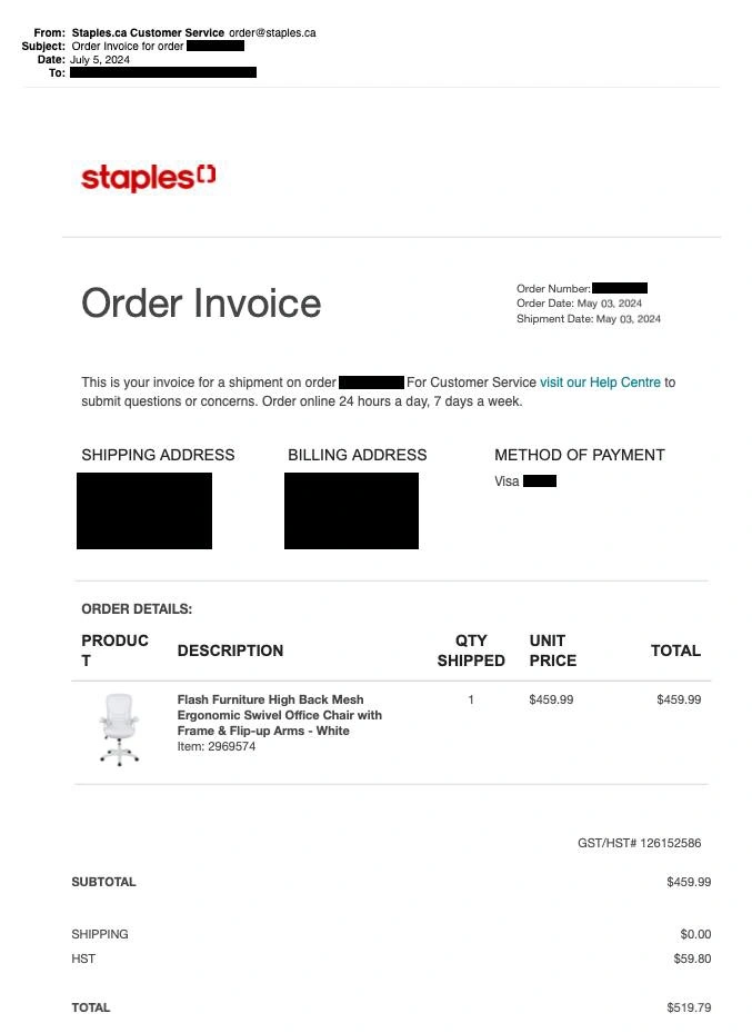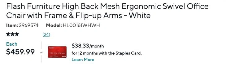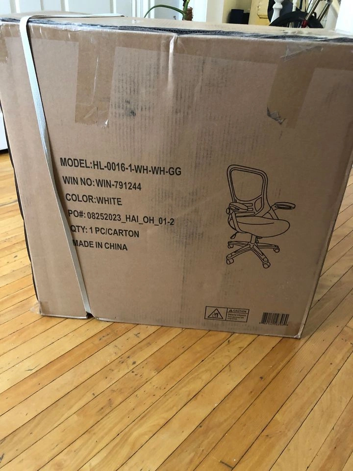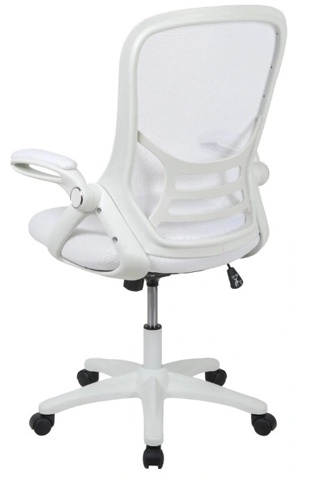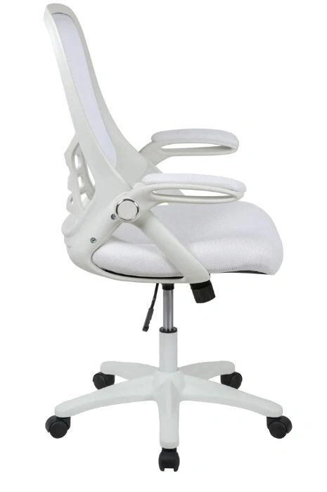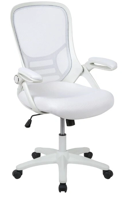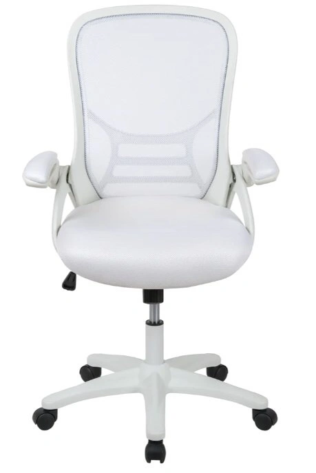 This office chair features a white mesh back and white fabric seat. It has adjustable height and swivels. It has arms and a five-star base.