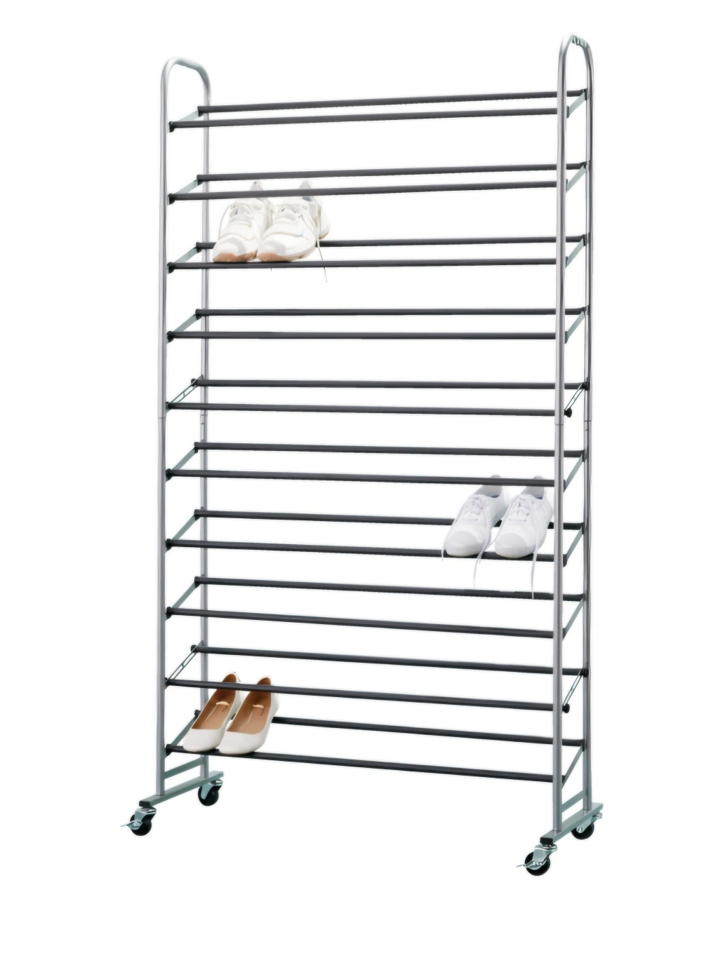 A radiant metal adjustable 10-tier shoe rack on wheels (removable). It's perfect for organizing your footwear and saving space.