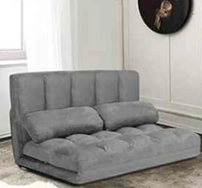 A grey futon couch with a back and two pillows. It is in good condition and folds out to become a bed.