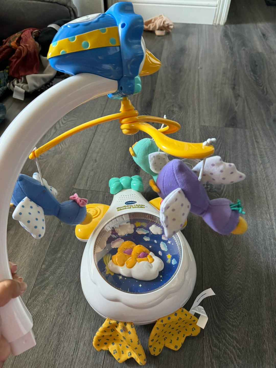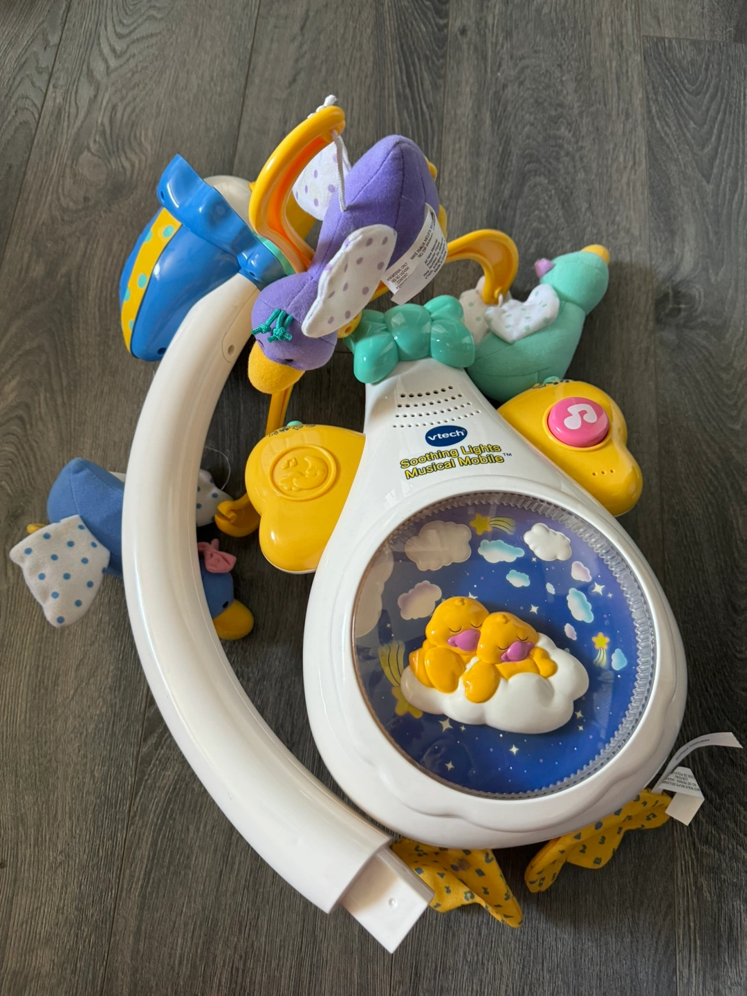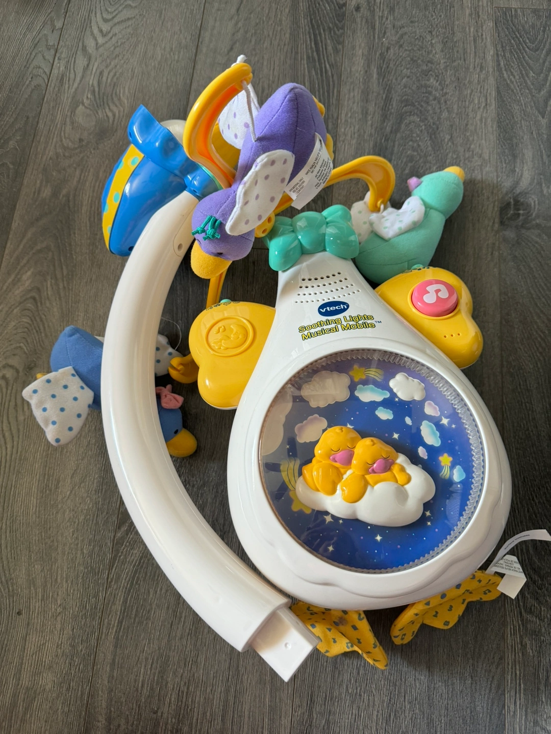 VTech Soothing Lights Musical Mobile. Plays a variety of melodies. Has a rotating mobile with plush animals. Includes a nightlight feature.