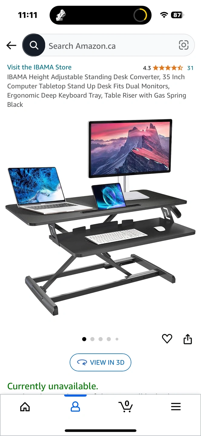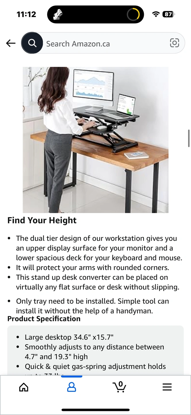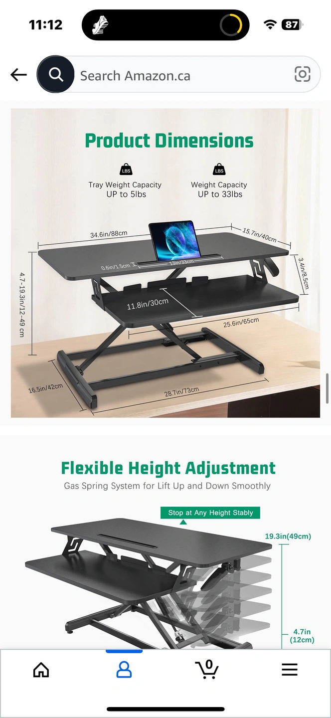 67Black standing desk converter with gas spring. Adjustable in height. Includes a keyboard tray. - Large desktop 34.6" x15.7" - Smoothly adjusts to any distance between 4.7" and 19.3" high - Holds up to 33 lbs. - Built-in tablet & smartphone display slot-Size:33*1.5cm(L*W) - Removable keyboard tray - Tablet/smartphone display slot: 33*1.5 cm(12.99''*0.59'') Original price $189.99