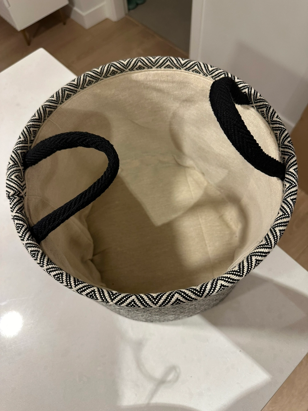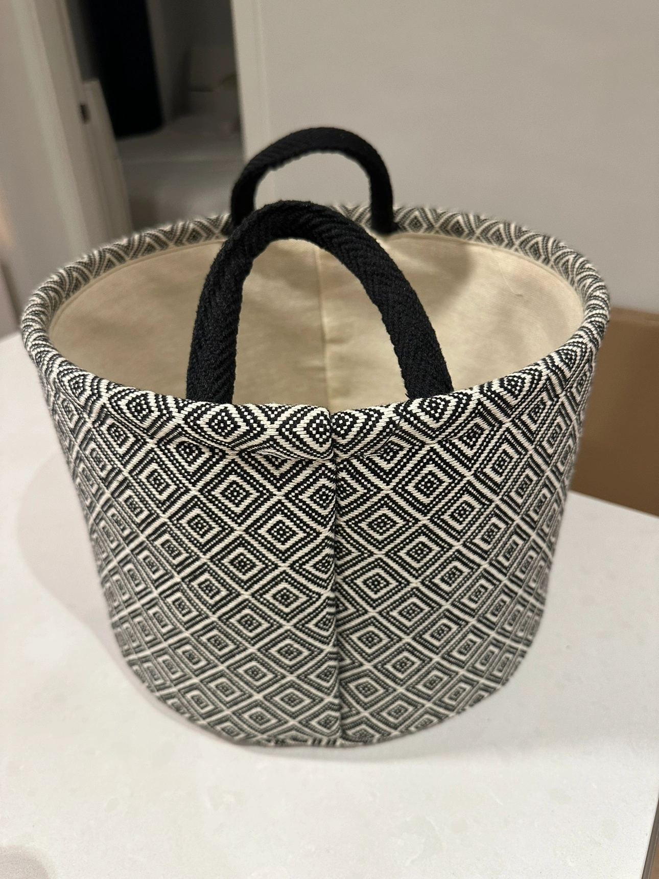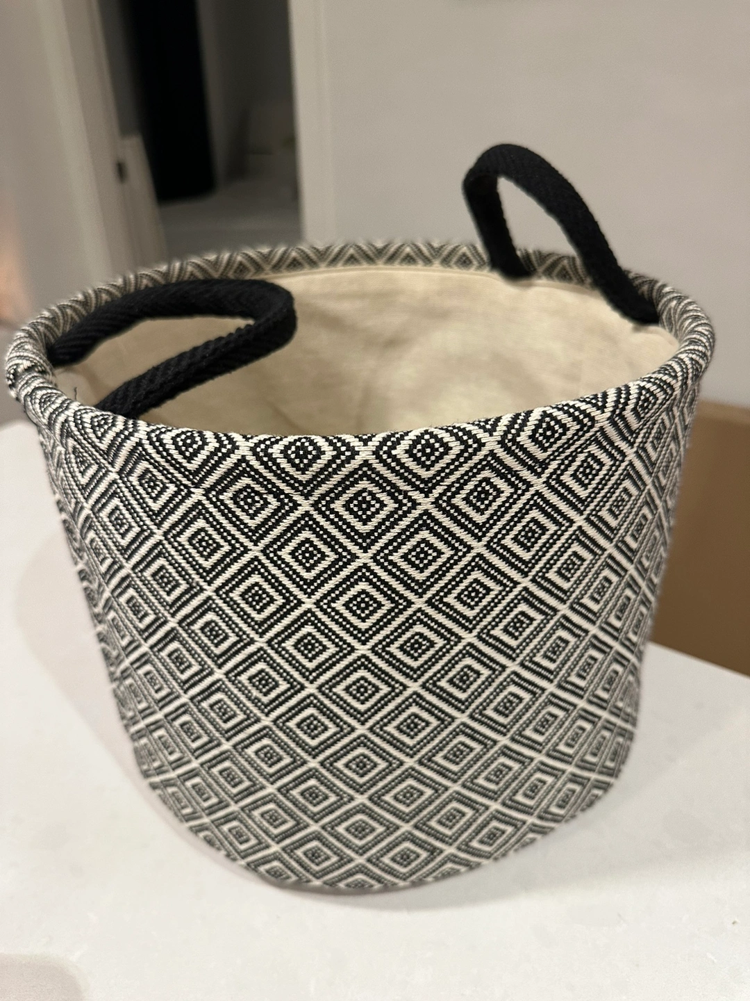 1000+Black and white patterned fabric storage basket with two black fabric handles. Good for storing toys, blankets, or other household items.