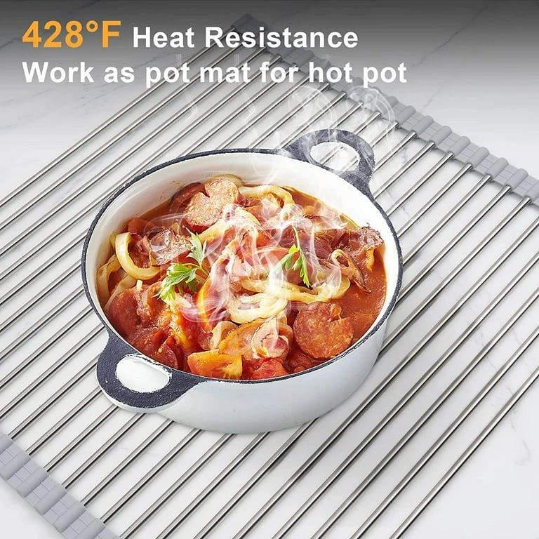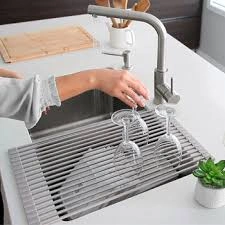 •Multi-purpose over Sink Roll-up Drying Rack: unrolling above an open sink for air-drying washed dishes, for additional counter top space, or as a trivet. Vegetable and fruit dish drainers, great kitchen dish racks for counter