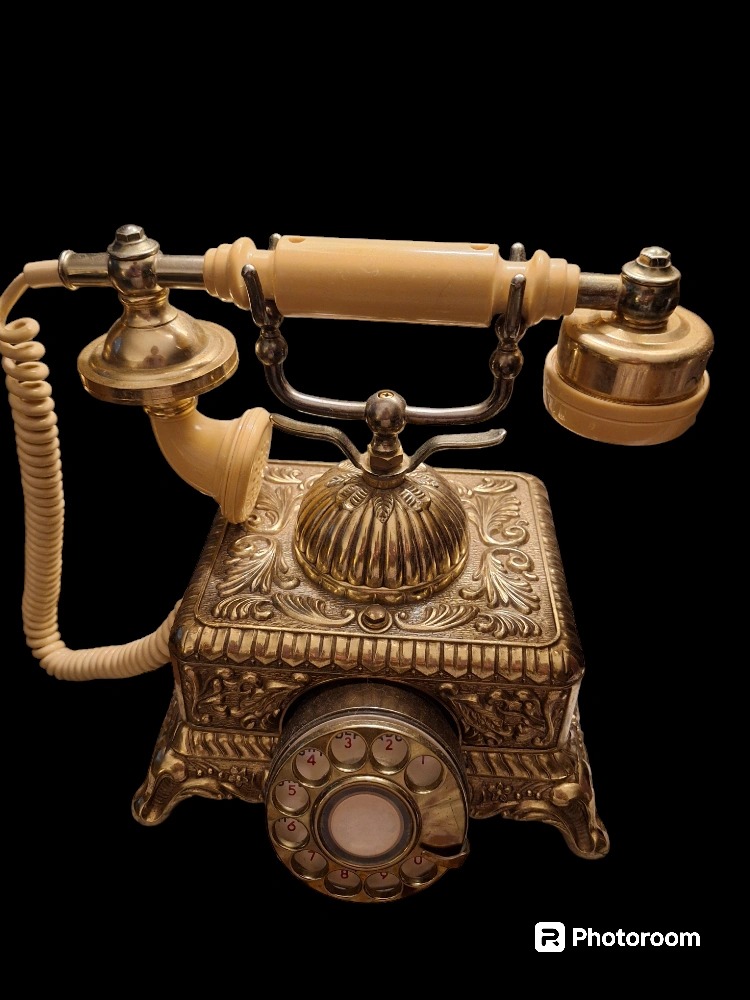 Ornate gold rotary phone with a cream-coloured handset and dial bakelite. The phone base has a detailed ornate design.
