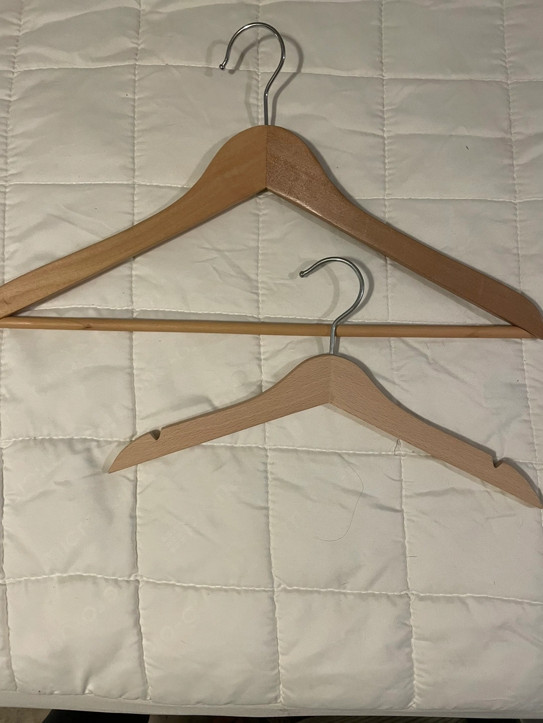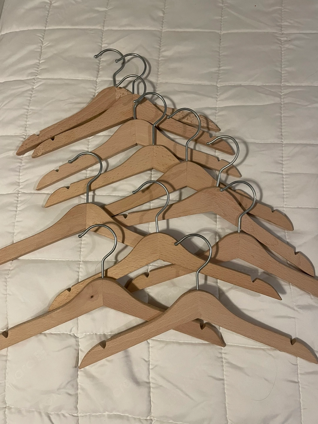 408About a dozen wooden hangers. All hangers have metal hooks. Ideal for children's clothing. Second pic only for comparison. Large hanger not included. Offered in a beautiful, hand -painted cloth bag at no charge.