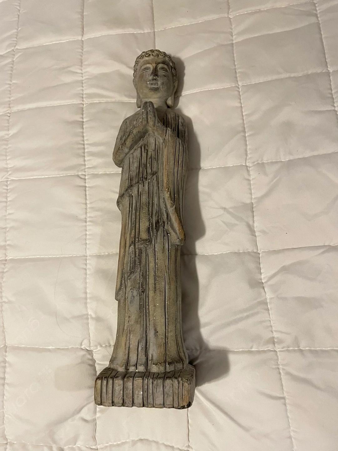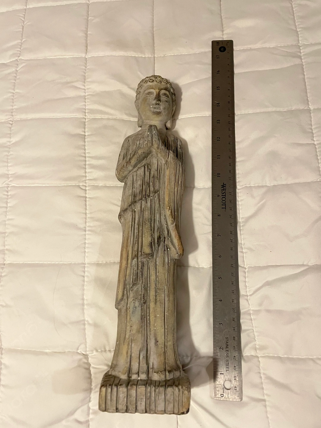 408A grey and white statue of a Buddha, with a detailed face, in a prayer pose. The statue is approx 16 inches tall. Fairly heavy.