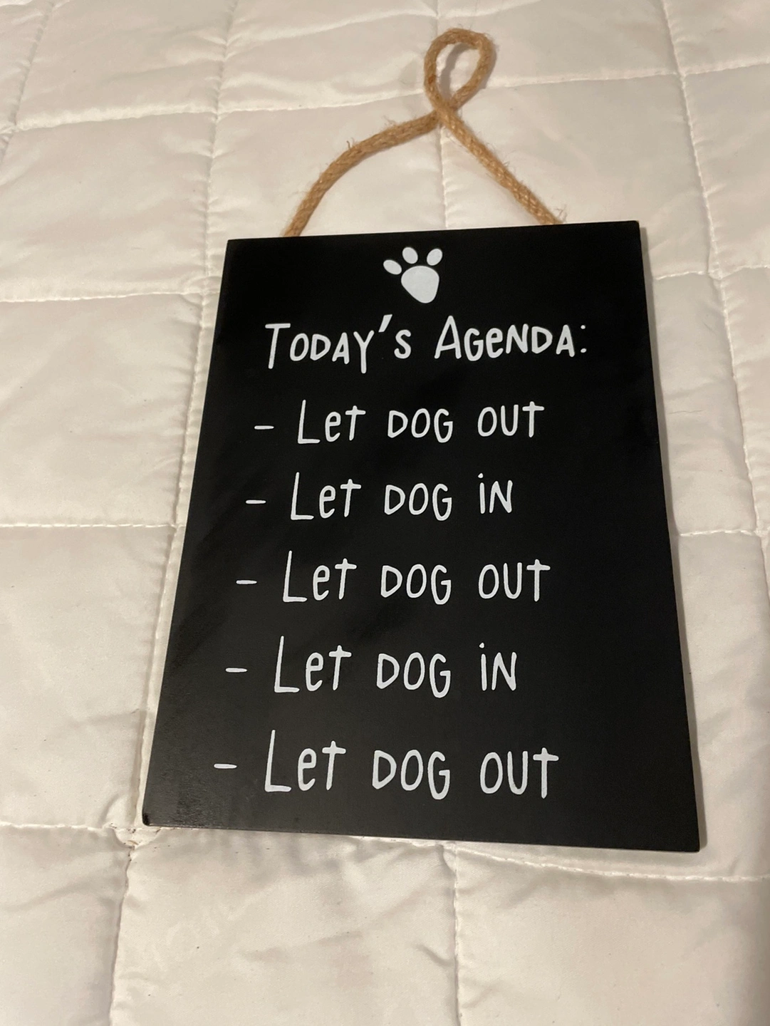 408Black sign with white writing and a paw print. Made of wood. Approx 8.5" high and 6.5" wide.