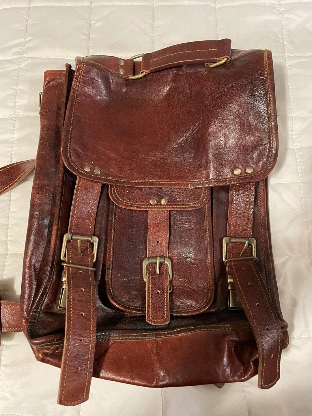 408Brown leather backpack with buckles and accents. The backpack features multiple compartments, including a large front pocket.