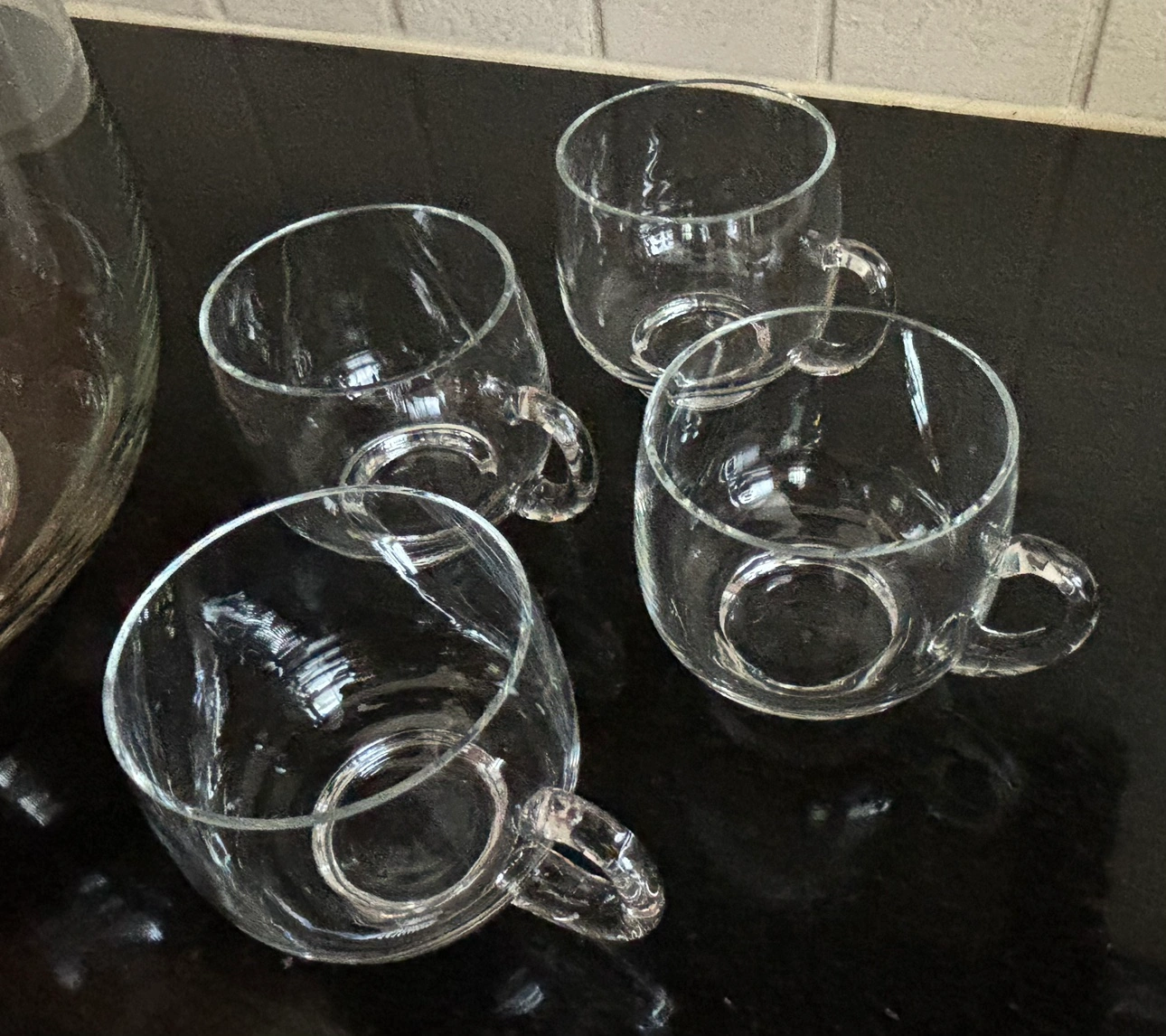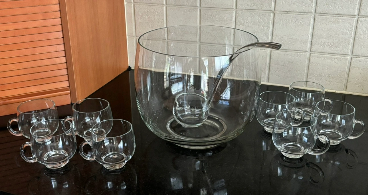 419Sleek and modern glass punch bowl set. Includes beautiful glass ladle with sleek curved handle and 8 cups. Punch bowl can hold up to 3 L Other than manufacturers’ imperfections - no chips or scratches. This set would make a beautiful centerpiece for your beverage table!