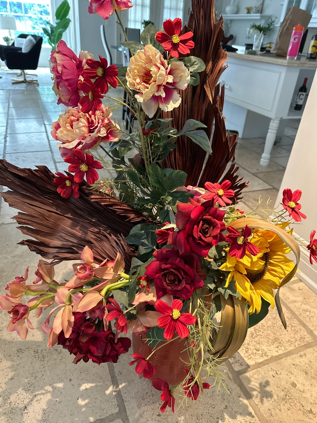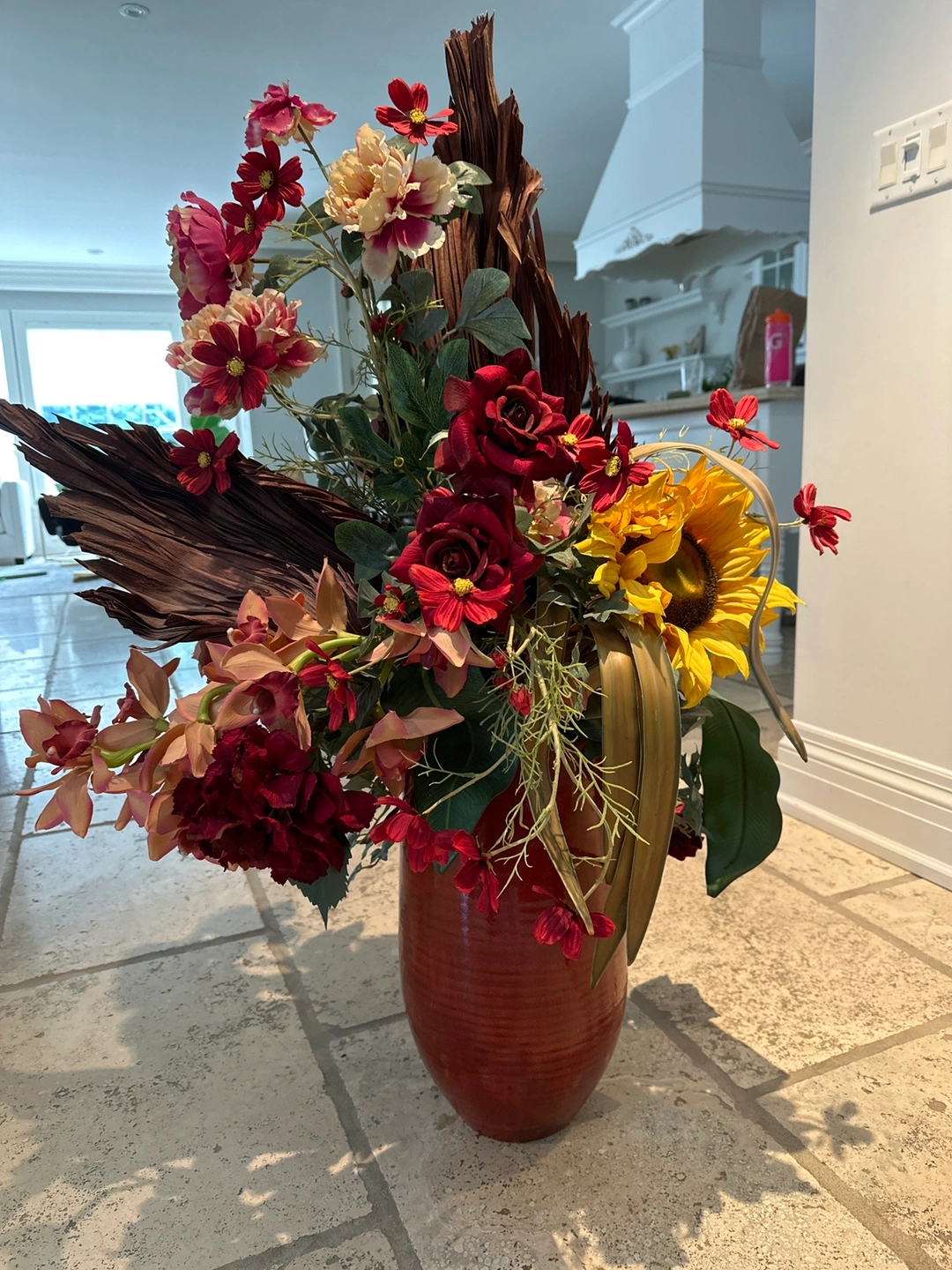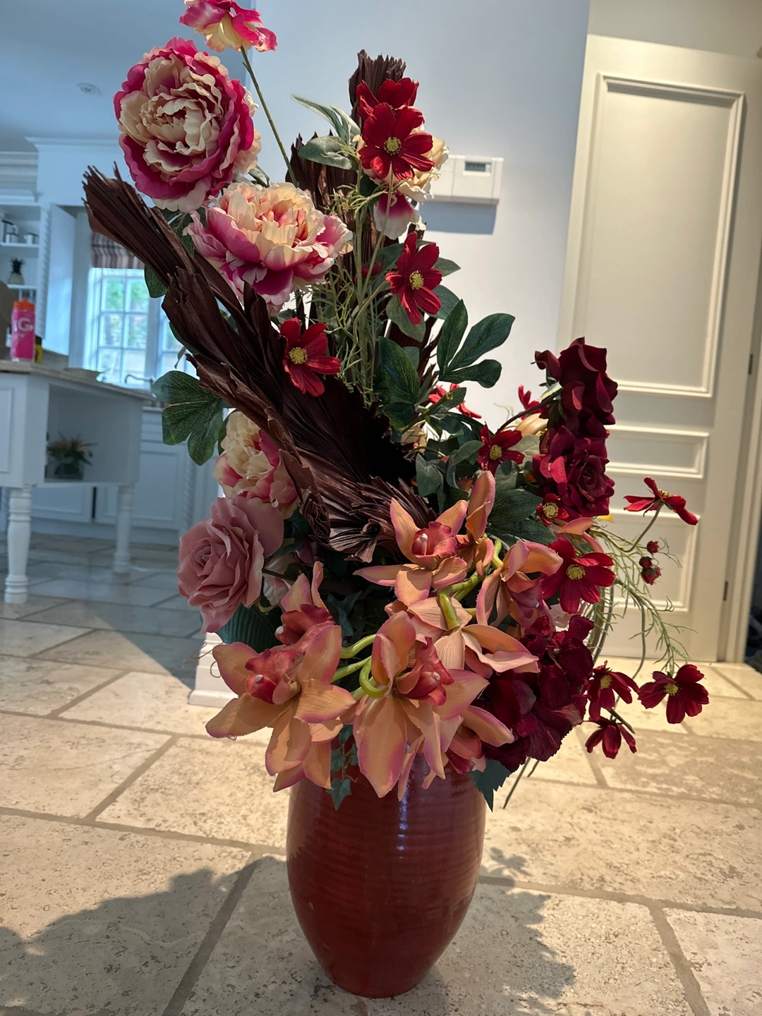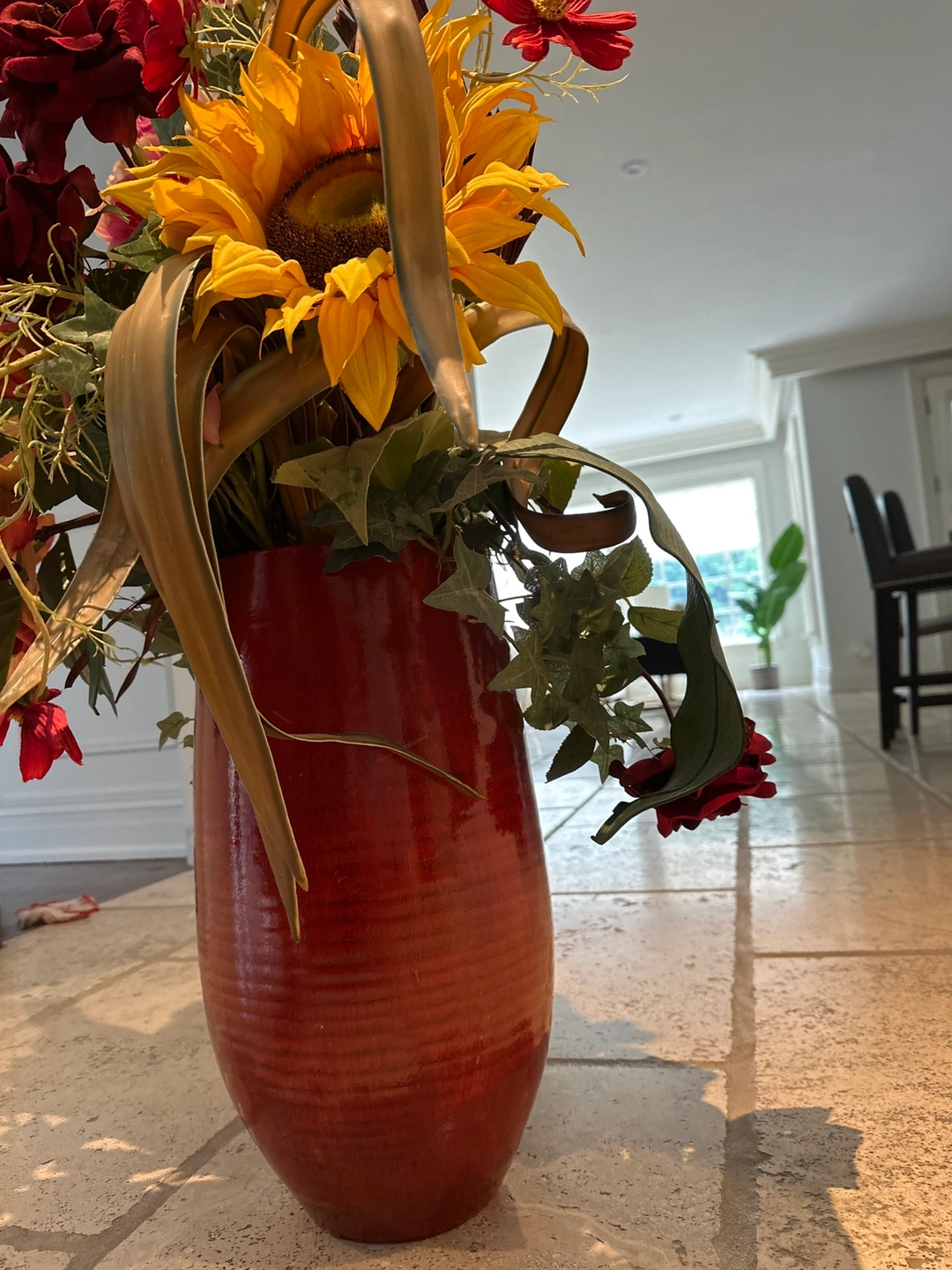 26A beautiful arrangement of silk flowers in a red vase. Perfect for adding a touch of colour and life to your home.