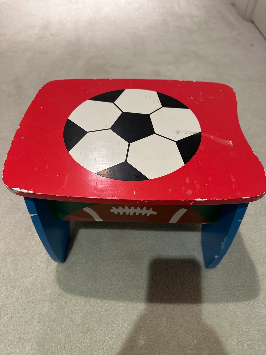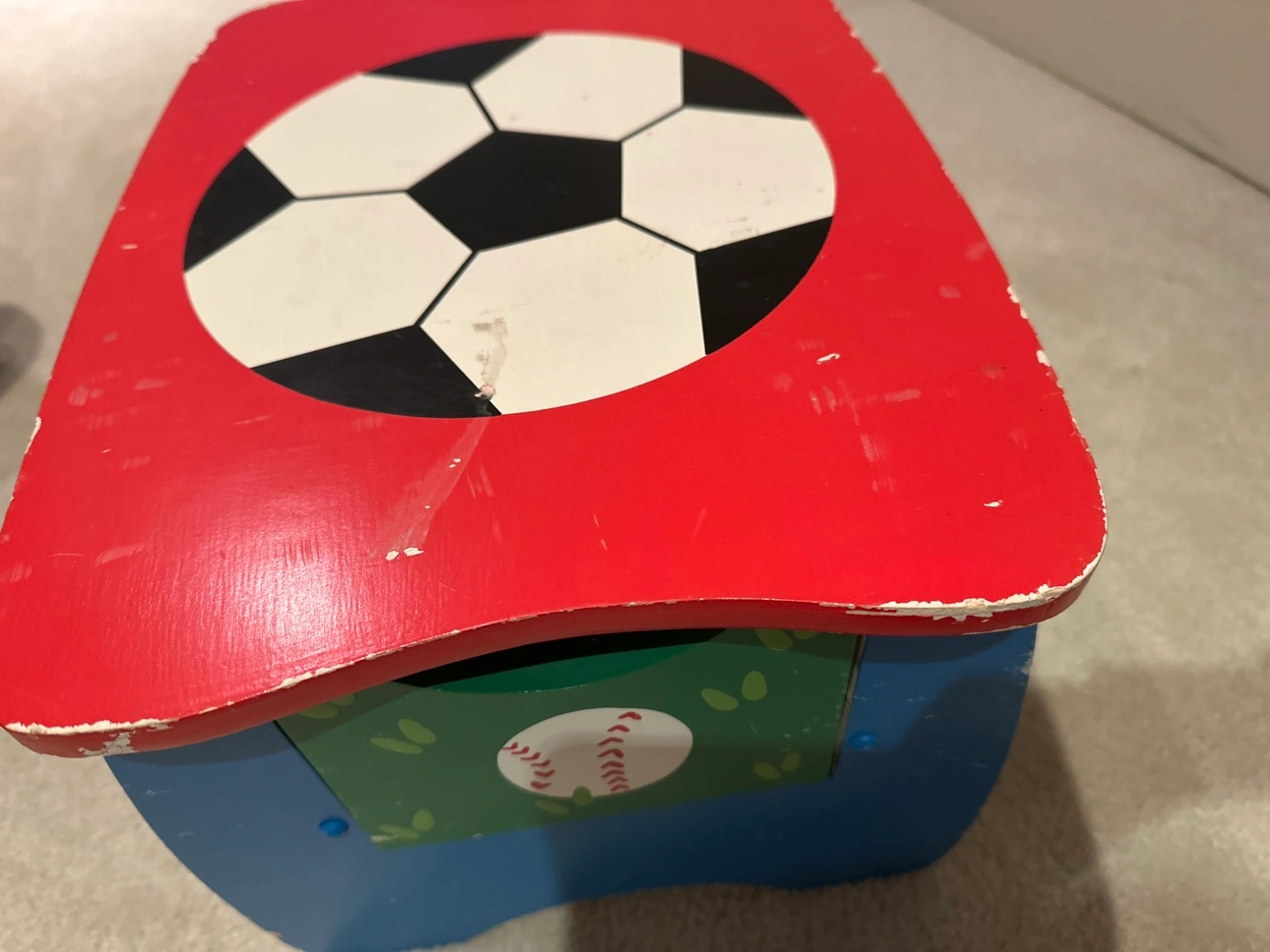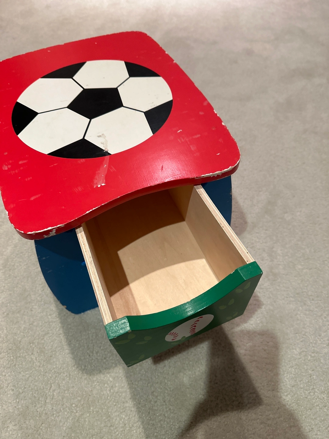 26Wooden stool with a storage drawer, featuring a soccer ball on the top and a football on the bottom.