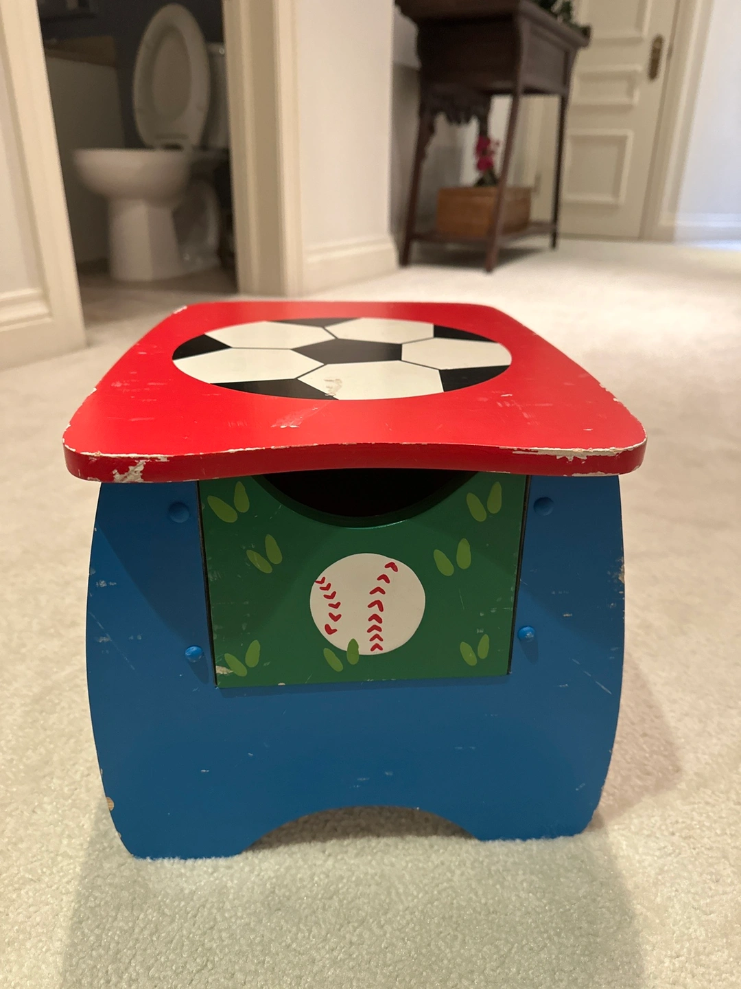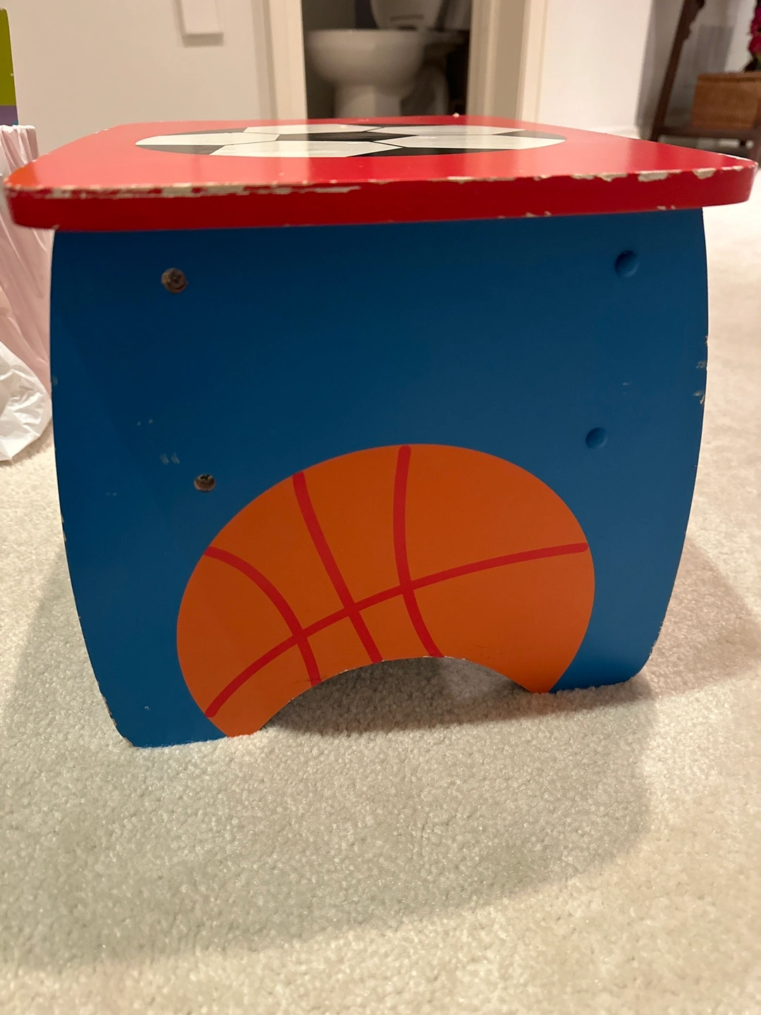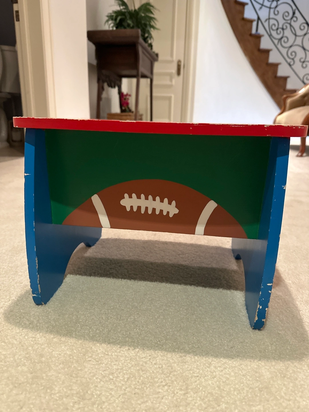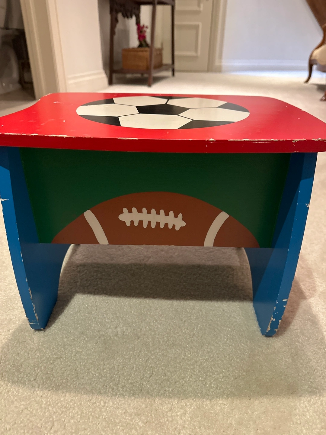 26Wooden stool with a storage drawer, featuring a soccer ball on the top and a football on the bottom.