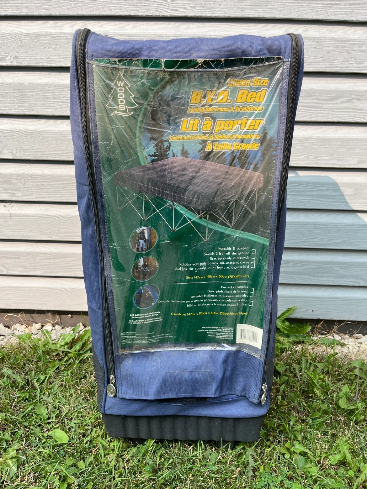 Queen size folding bed frame with a carrying case. Portable and compact, it stands 2 feet off the ground and sets up easily in seconds. Ideal for a cottage, or at home as a guest bed. Includes a soft poly cotton air-mattress cover. Size: 58"x78"x24".