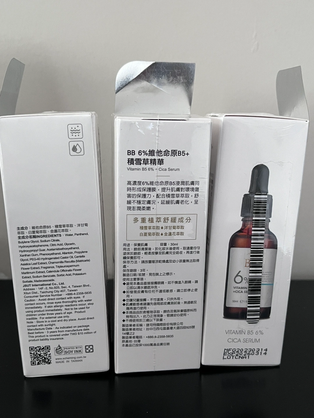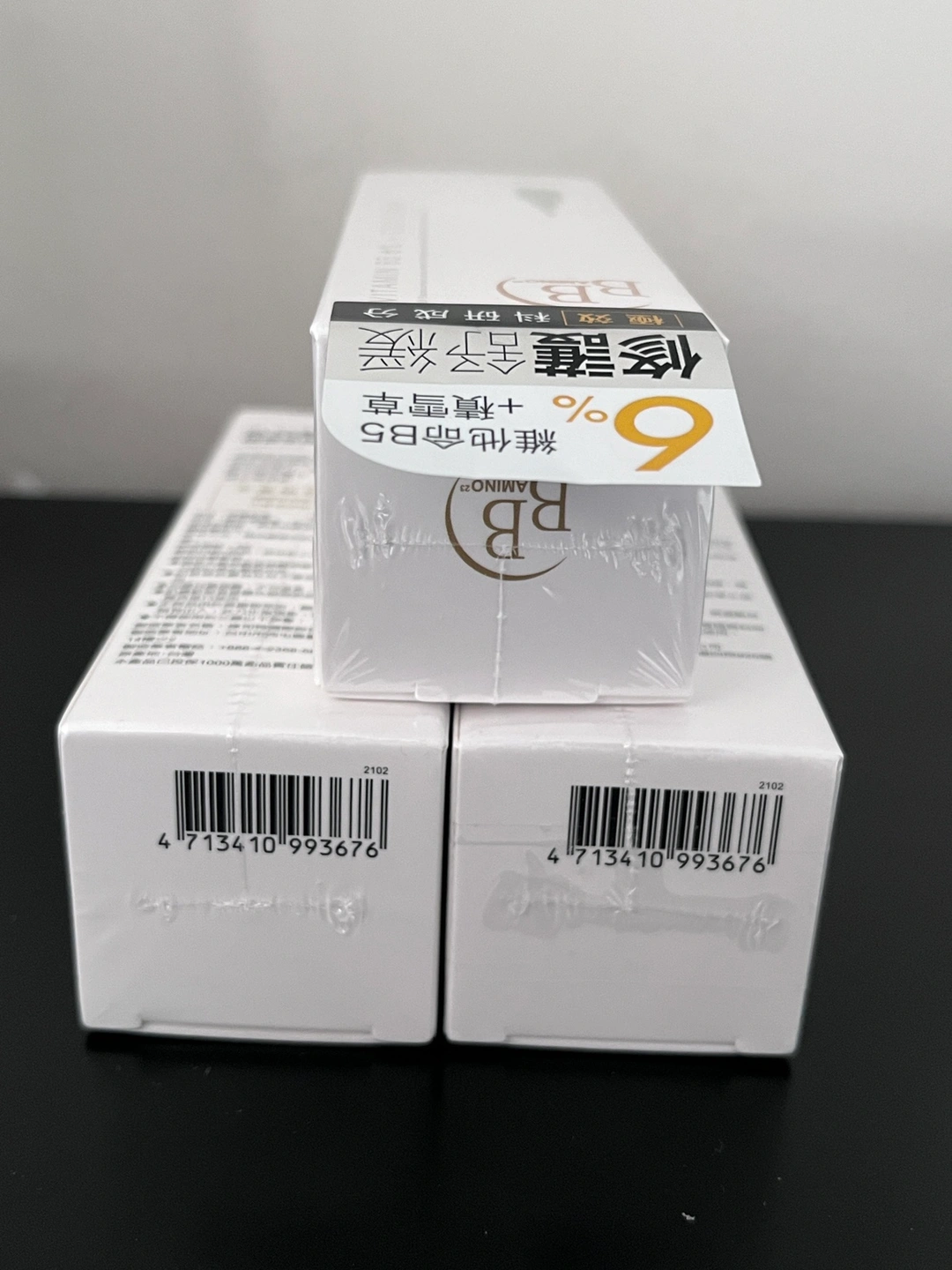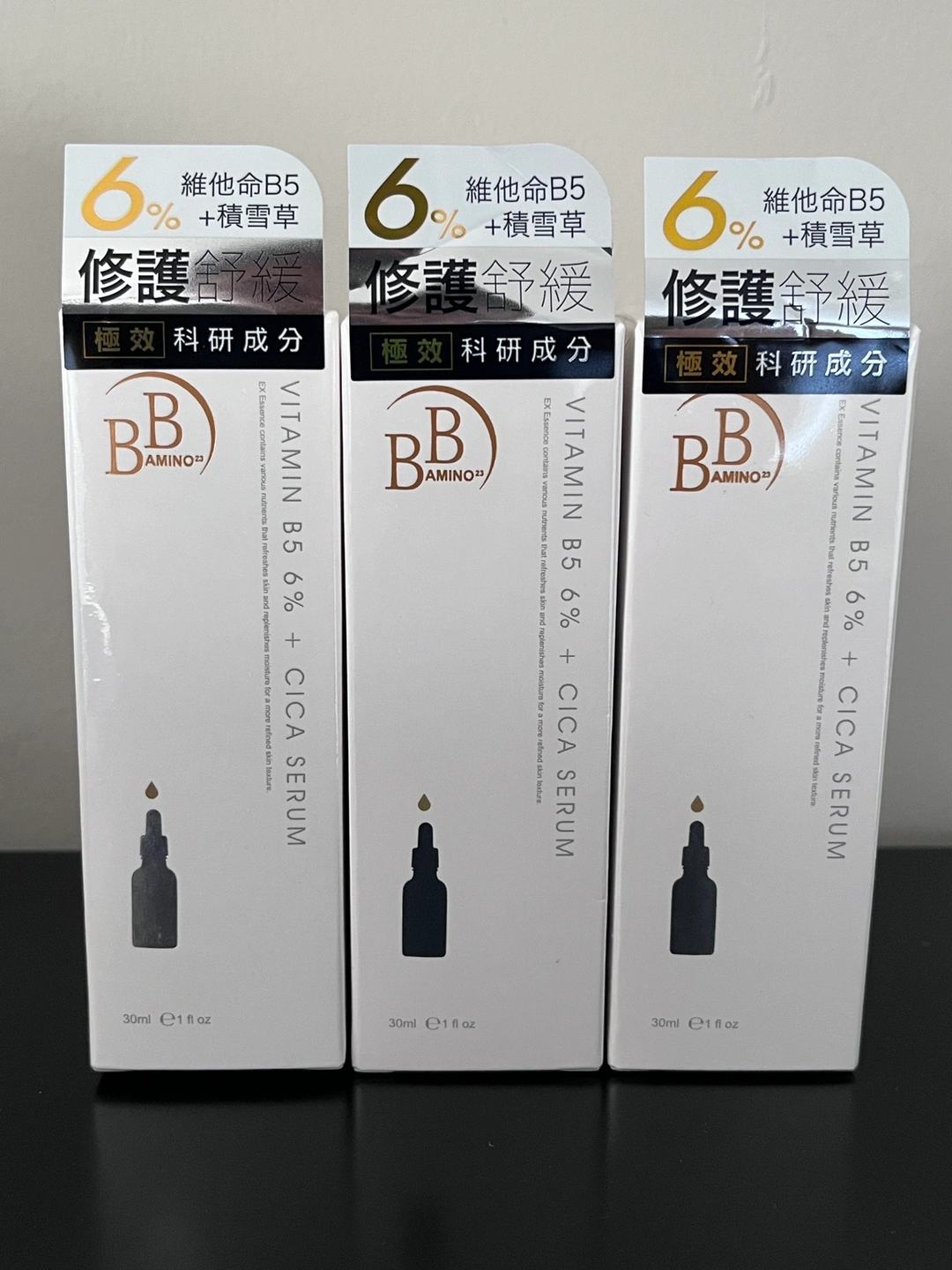 Three boxes of BB Amino Vitamin B5 6% Cica Serum. Each box contains 30mL of serum.