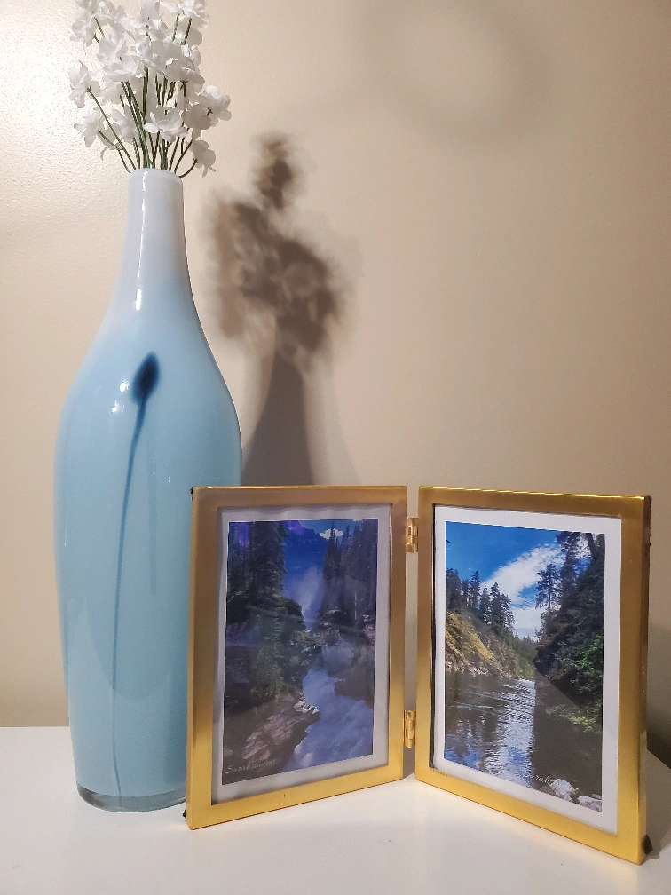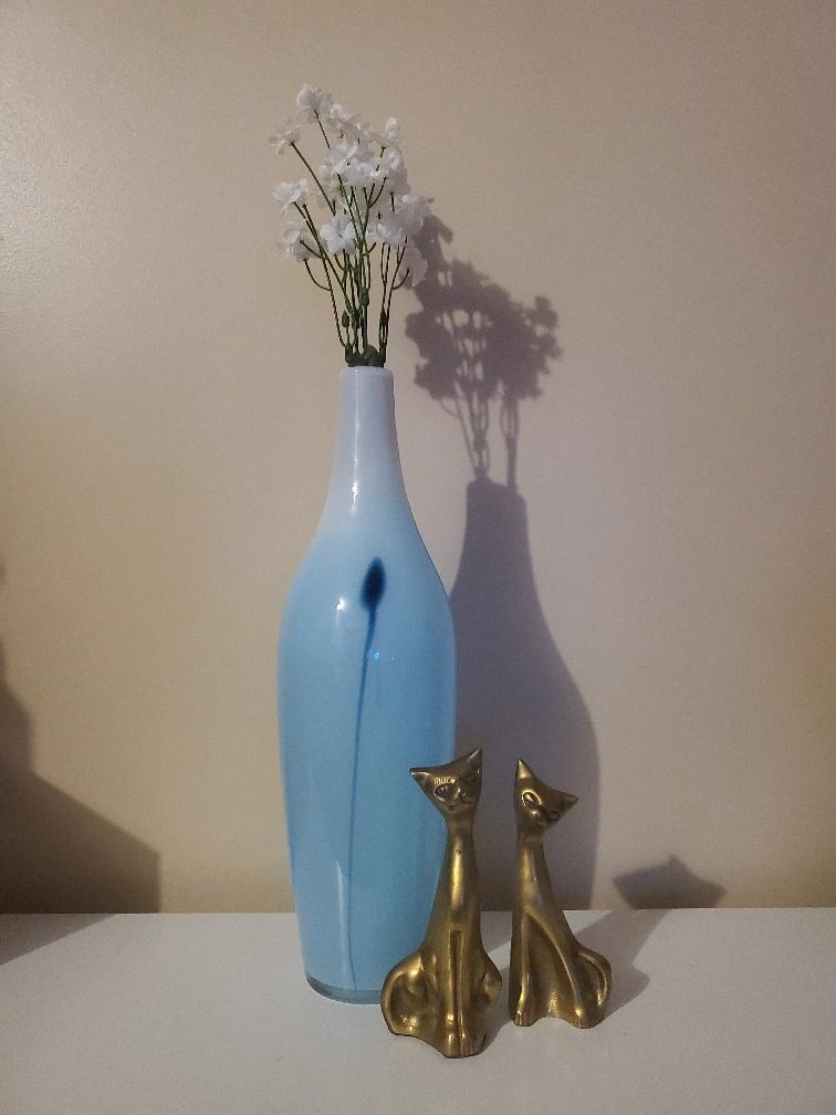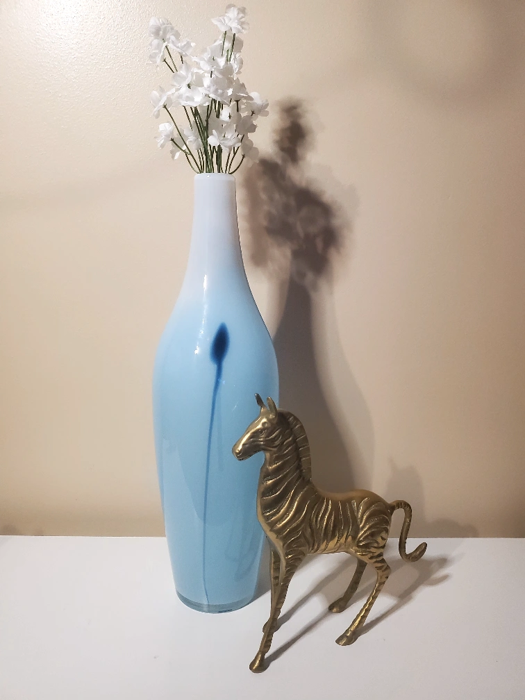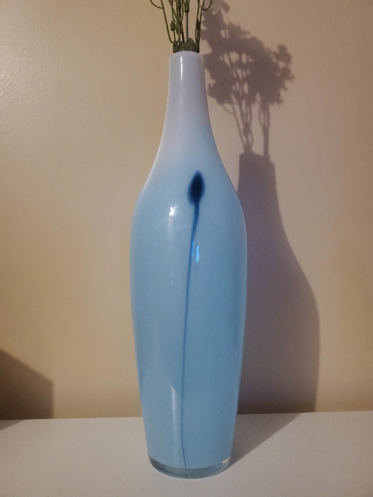 242Beautiful blue and white glass vase. It has a long, narrow shape with a wide base and a thin neck. It is perfect for displaying fresh or dried flowers.
