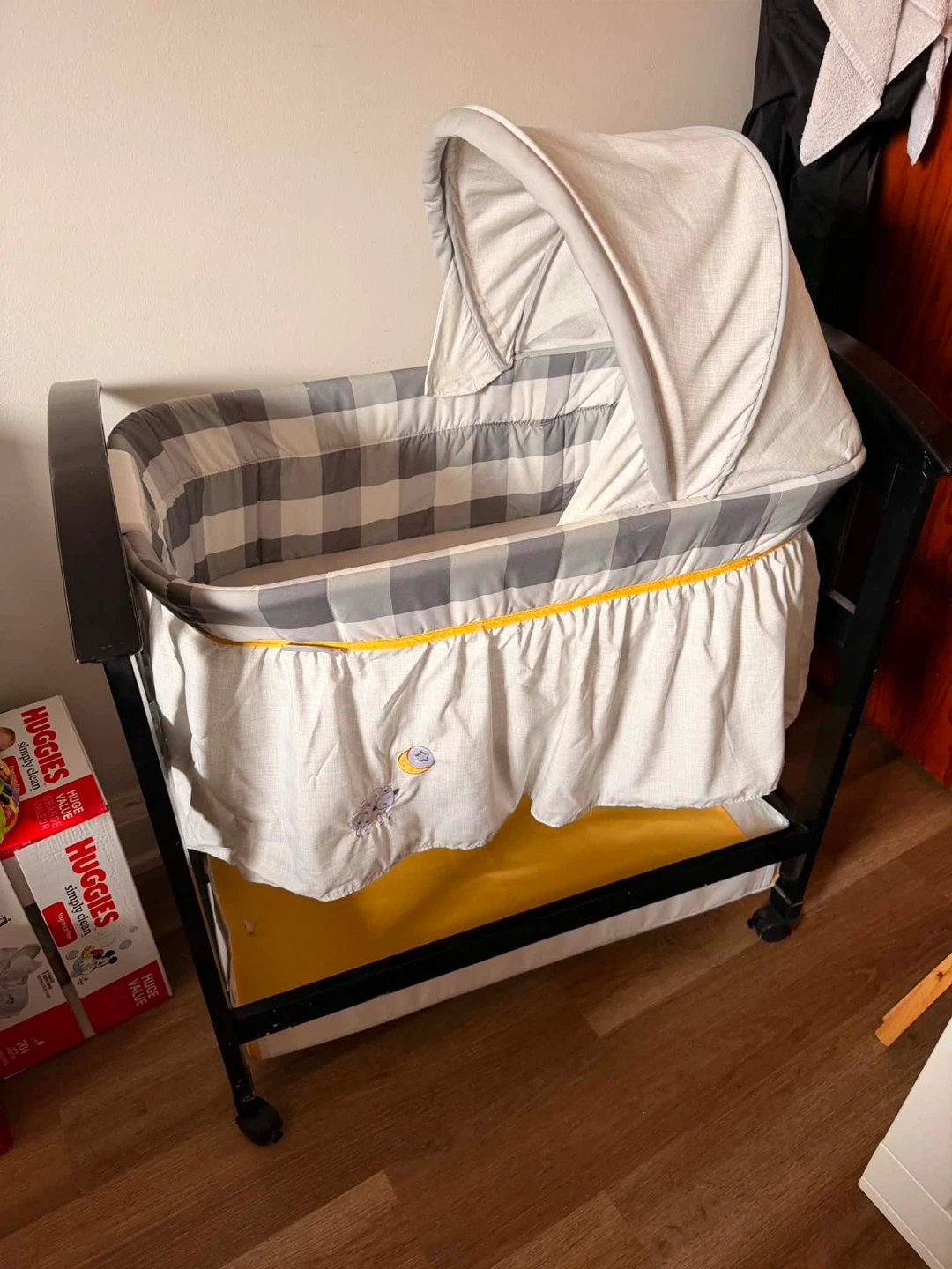 Grey and white checkered bassinet with a canopy. It has a yellow storage basket underneath and wheels for easy movement. Great for keeping your little one close. (No mattress)