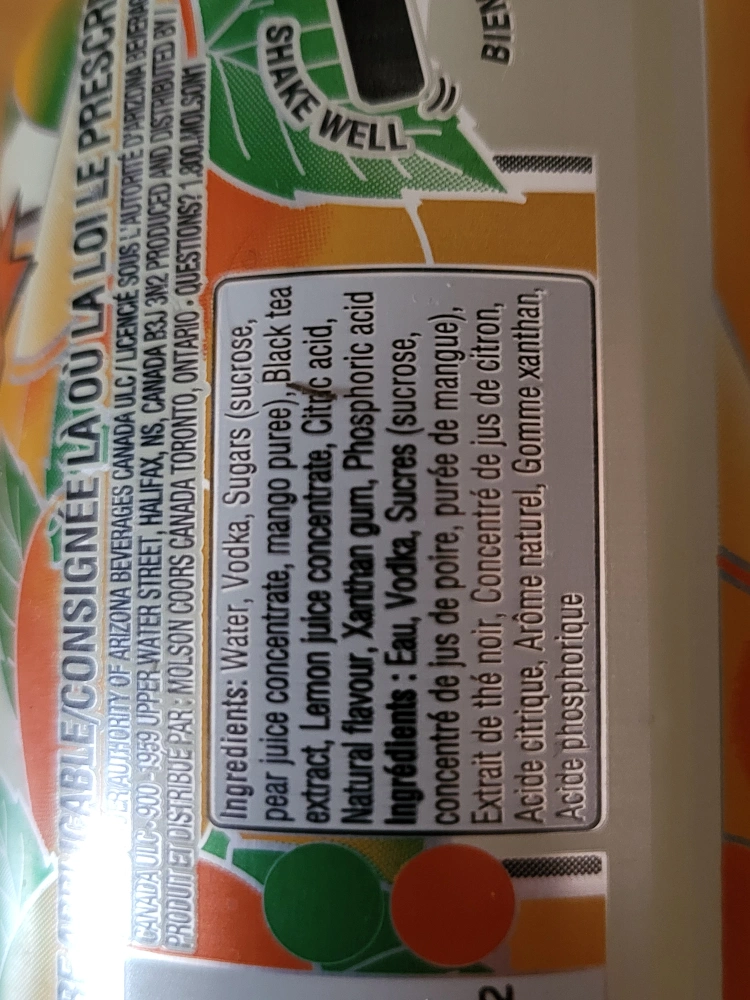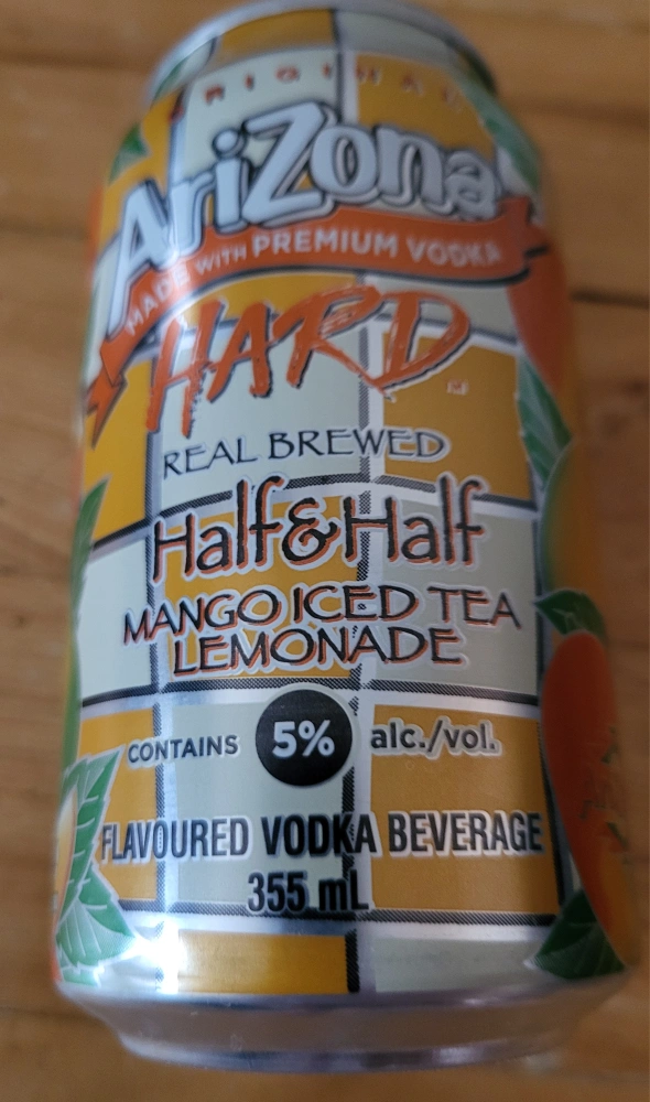 355 ml can of Arizona Hard Half & Half Mango Iced Tea Lemonade. Flavoured vodka beverage. 5% alc/vol.