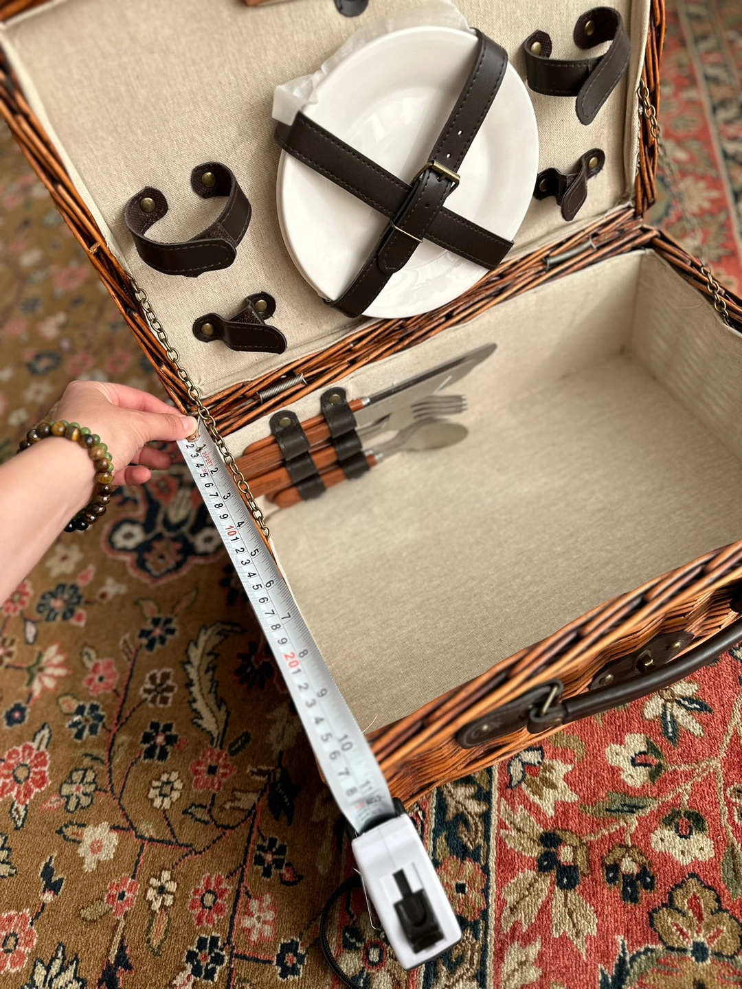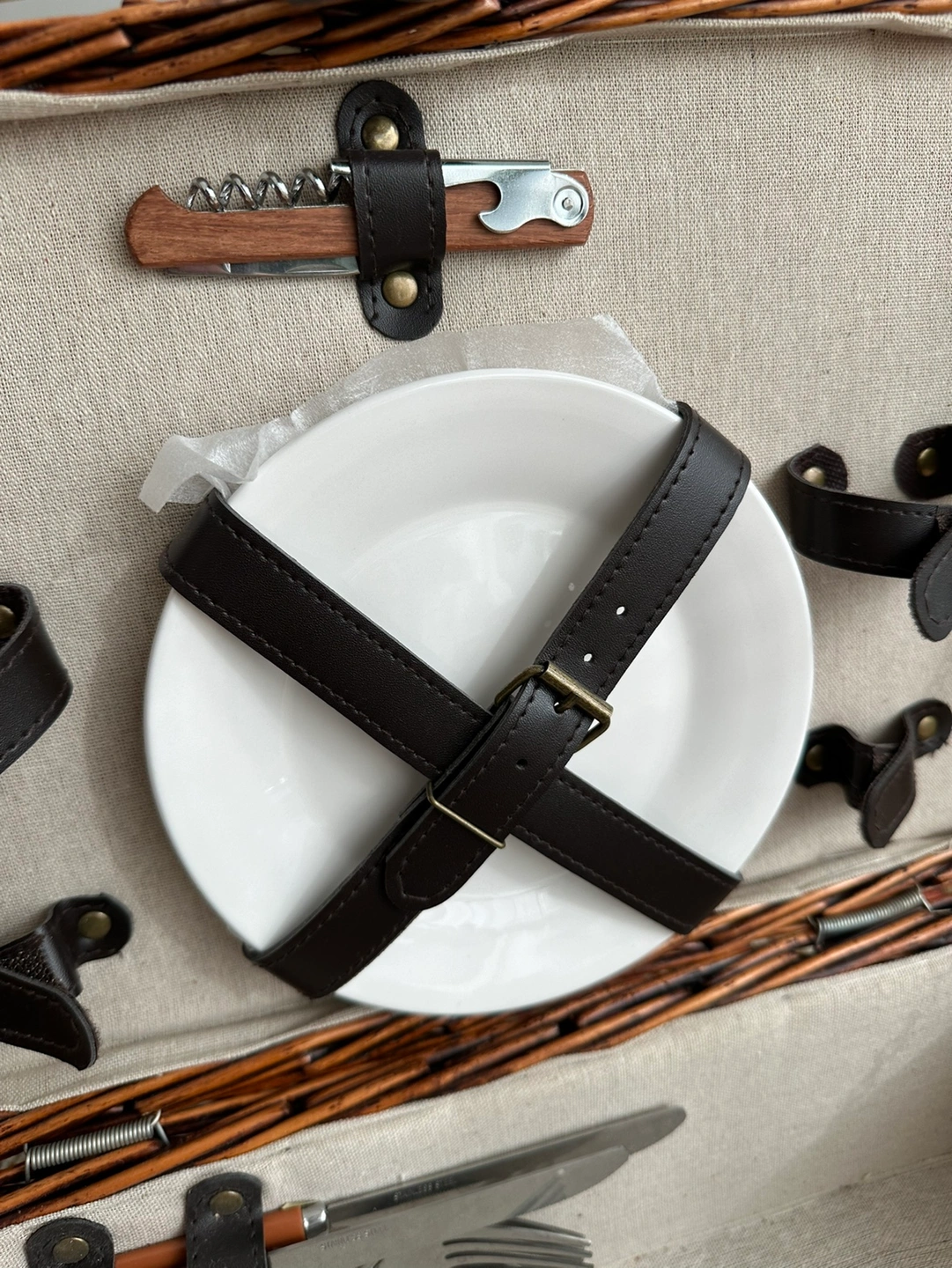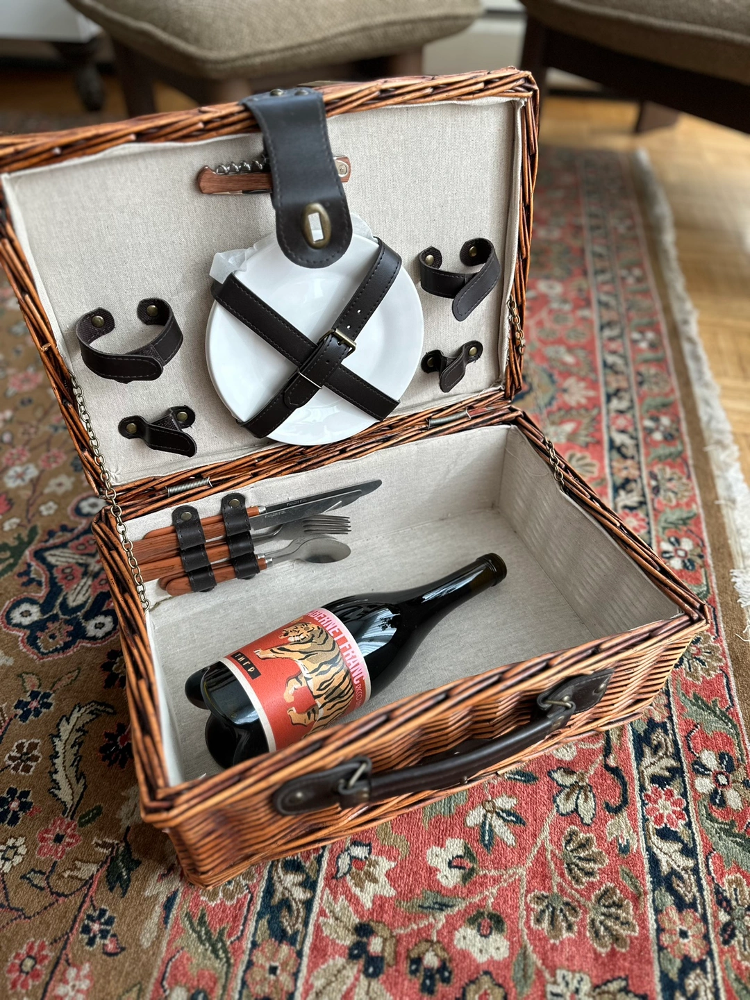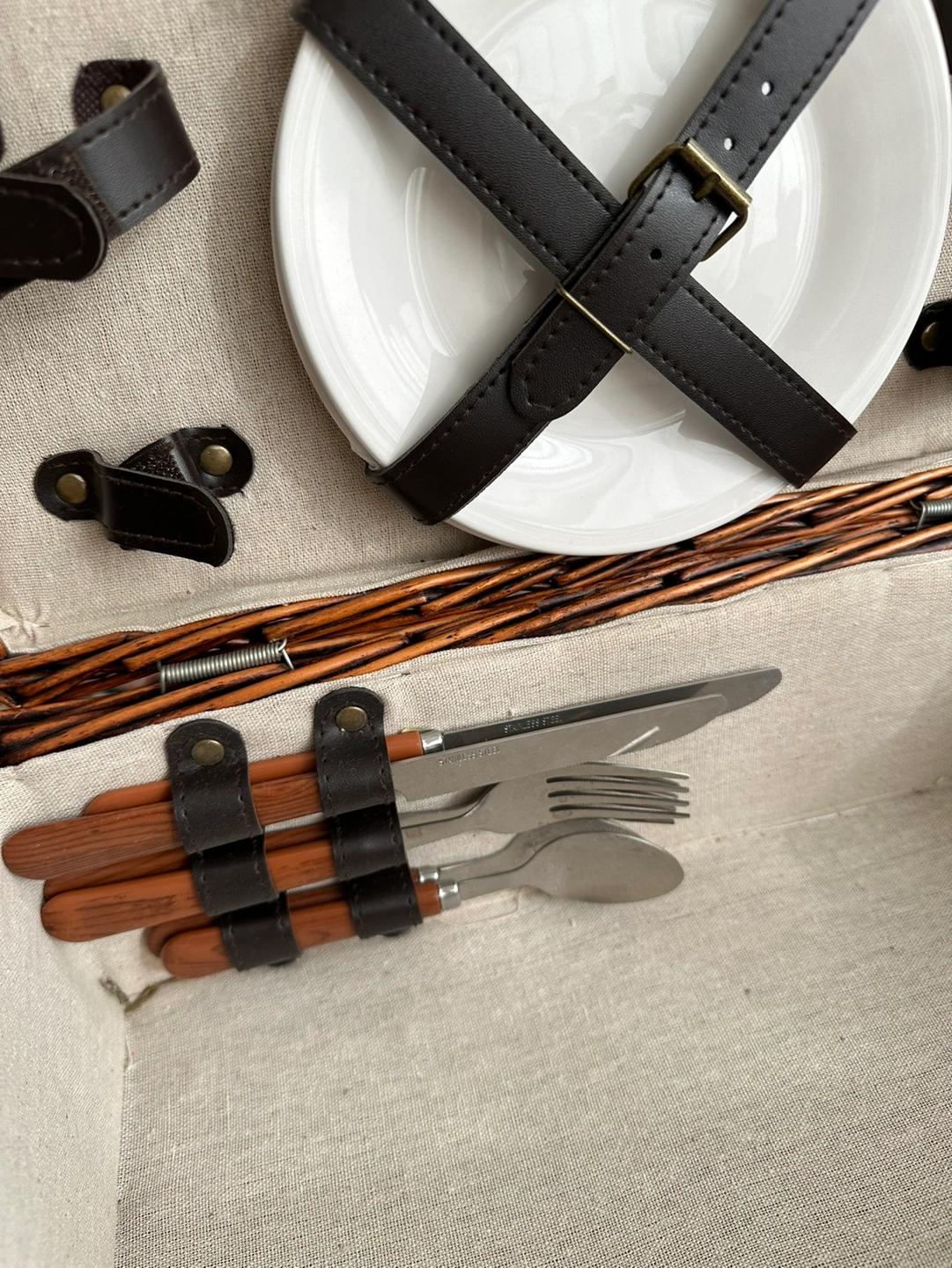 This cutest wicker picnic basket comes with a full set of plates, cutlery, its just missing the glasses. It also has a bottle opener and a small chain to help secure the lid.