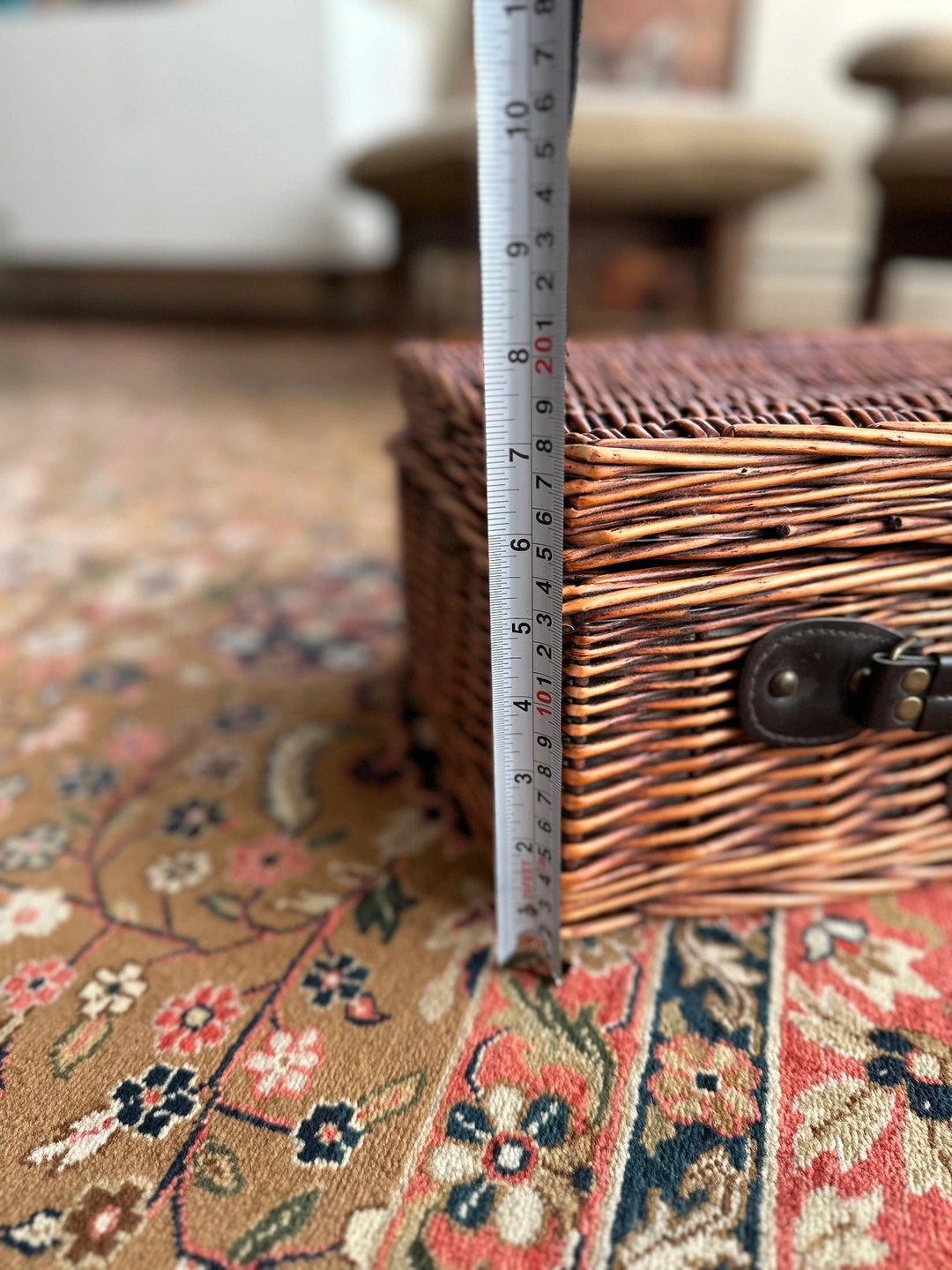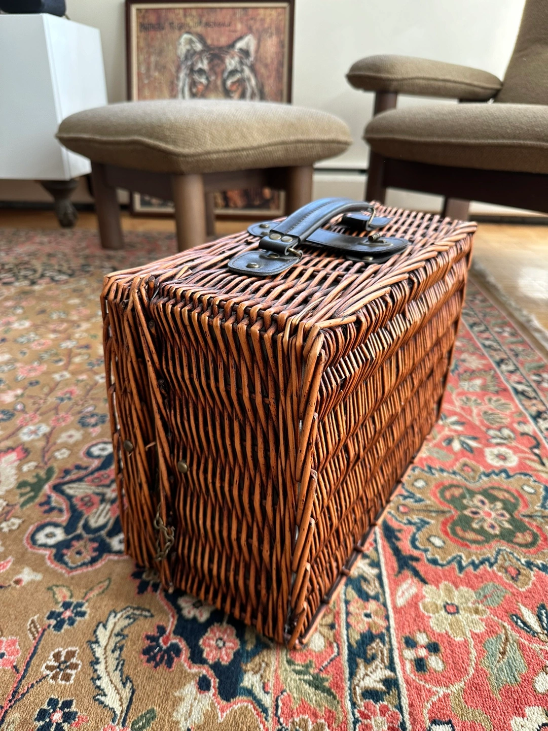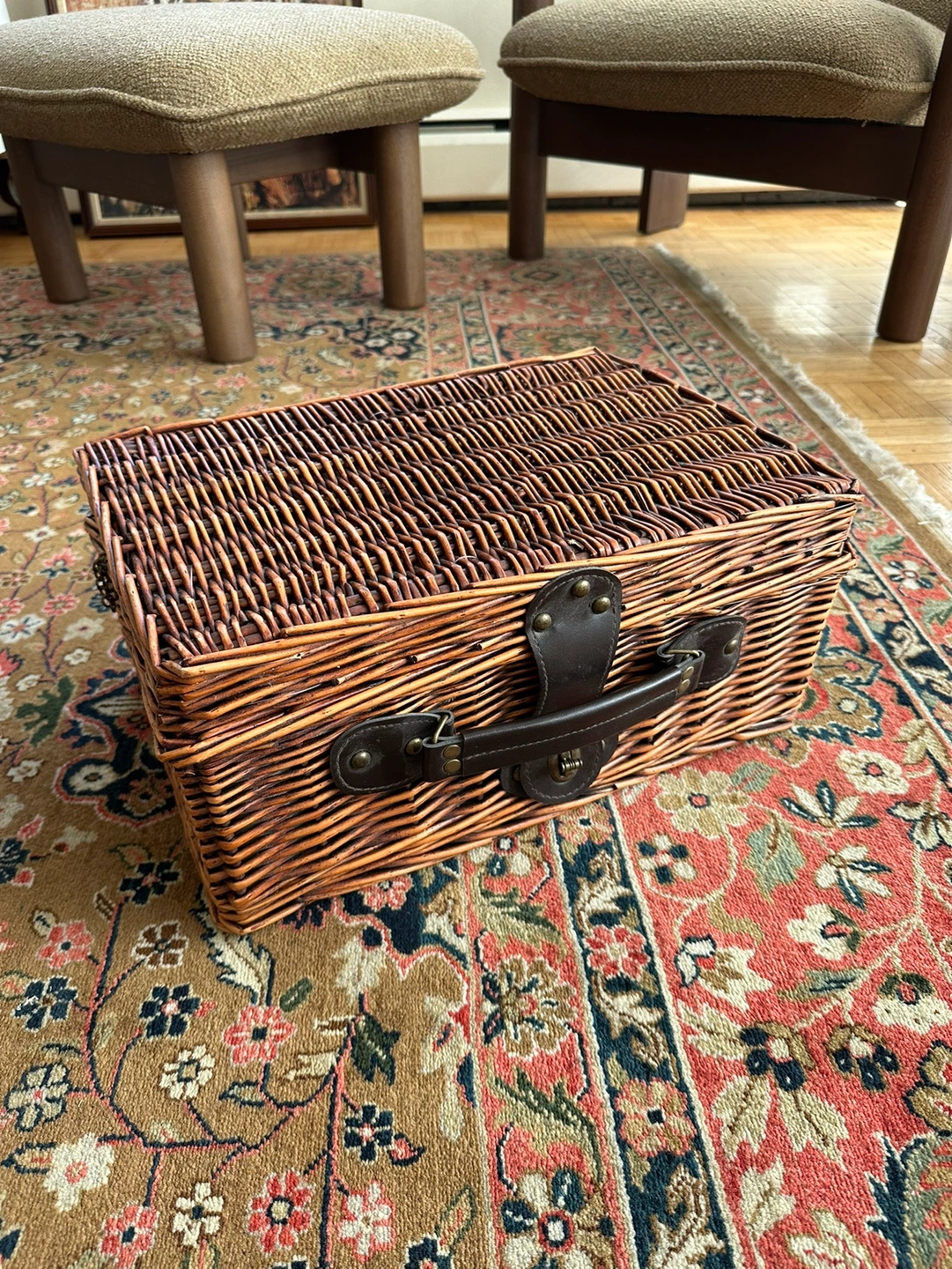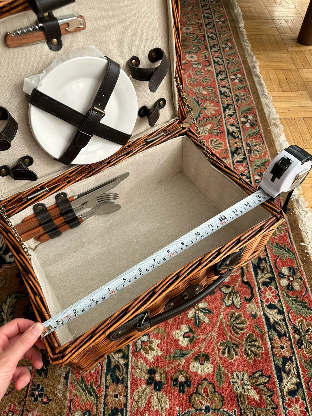 This cutest wicker picnic basket comes with a full set of plates, cutlery, its just missing the glasses. It also has a bottle opener and a small chain to help secure the lid.