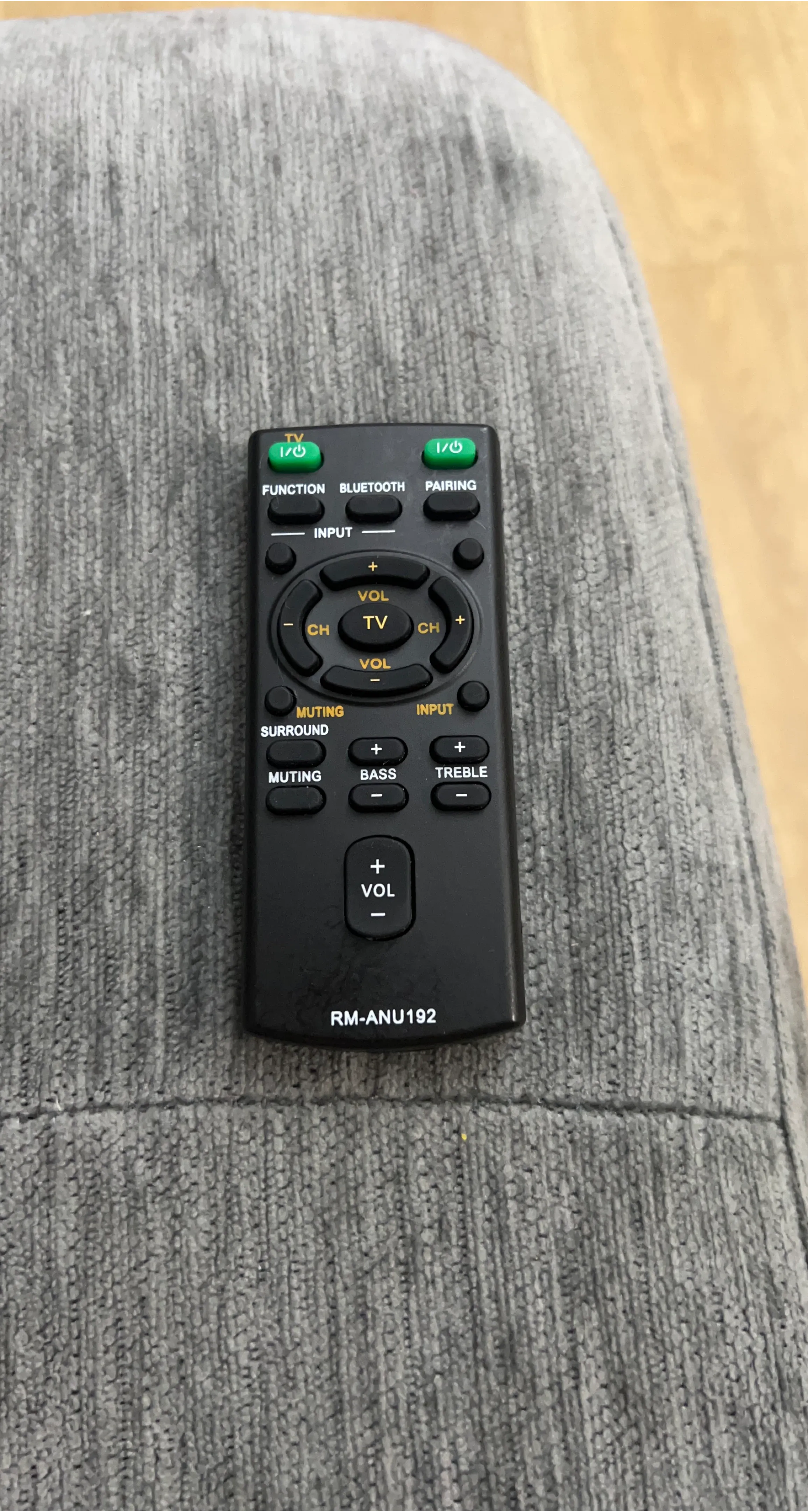 Sony RM-ANU192 remote control for audio systems. It has buttons for volume, bass, treble, input, and surround sound. A handy replacement or spare for your home theatre setup!