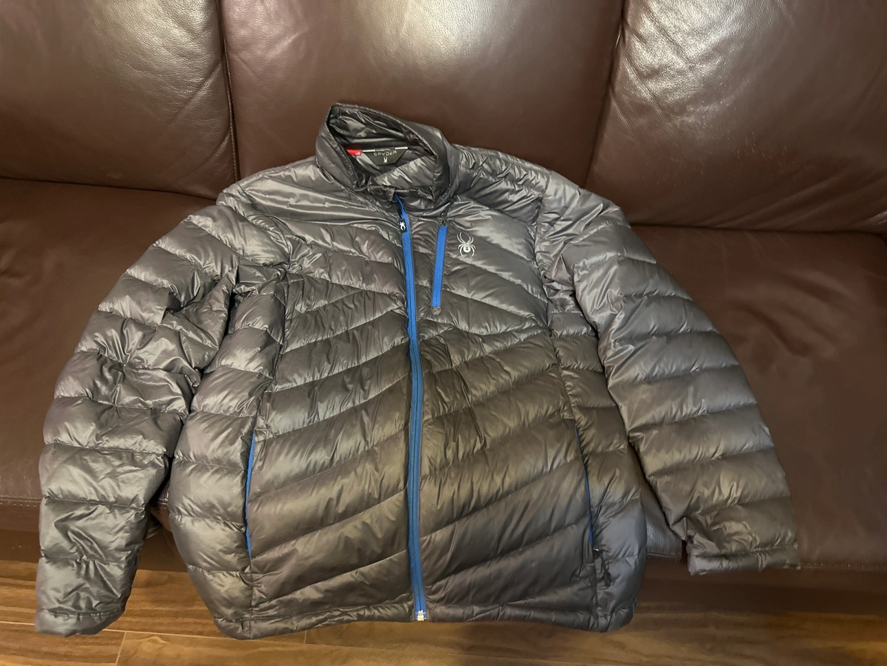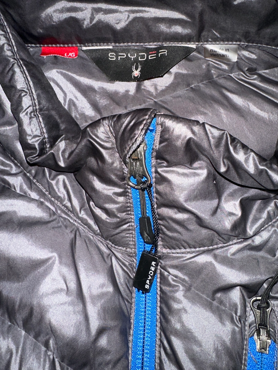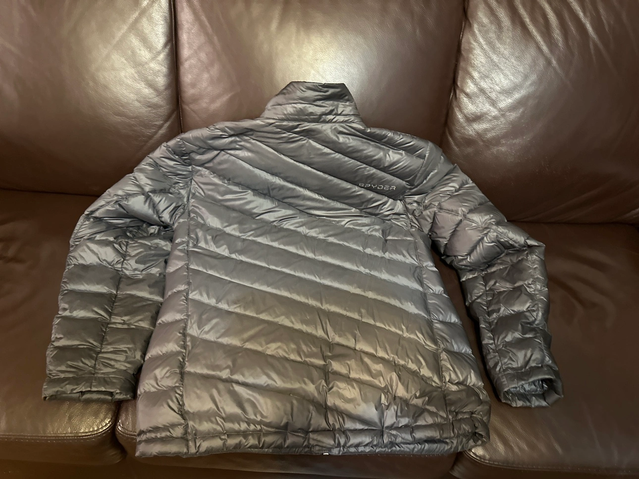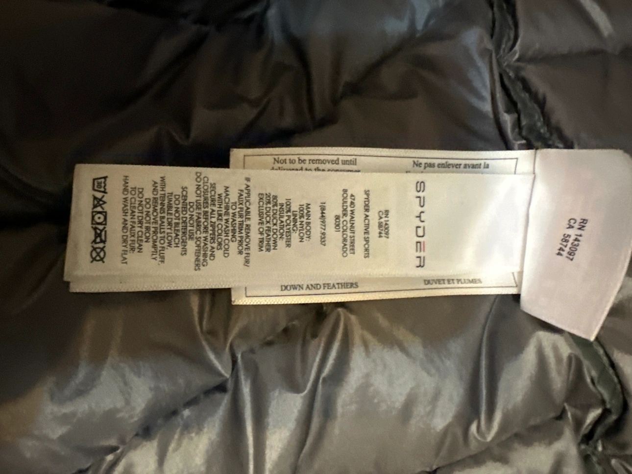 I used my others jackets more often . It’s in good condition. All zippers work fine . Spyder Syrround Down is made with 600 fill down, waterproof Spylon DWR, & engineered baffled construction to create the best and warmest layer. The whole jacket can be rolled up & tucked into its own pocket, so you can layer when the temperature drops. DESIGN: Unique to Spyder, the engineered baffled construction increases warmth by combatting cold spots, which can afflict other down jackets. It also includes reflective detailing and center front and chest reverse coil zippers. FEATURES: The Syrround Jacket features a fixed insulated hood with adjustable opening, a reverse coil center front and chest pockets zippers, zippered hand pockets, and packs into the wearer’s left pocket to make packing easier. MATERIAL: The Syrround Down’s fabric is engineered Nylon Syrround Woven Baffle and Spylon DWR. Spylon has a hydrophobic finish that repels rain and snow, decreases dry time, and keeps you outside longer. Our 600 Fill Duck Down will keep you warm & toasty.