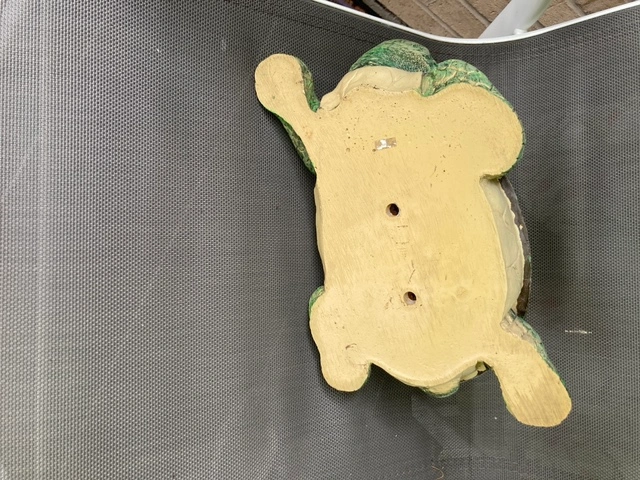 A decorative turtle shoe brush. The brush is made of a natural material. The turtle is made of resin. The turtle is approximately 11 inches long. It has been used and shows signs of light wear.