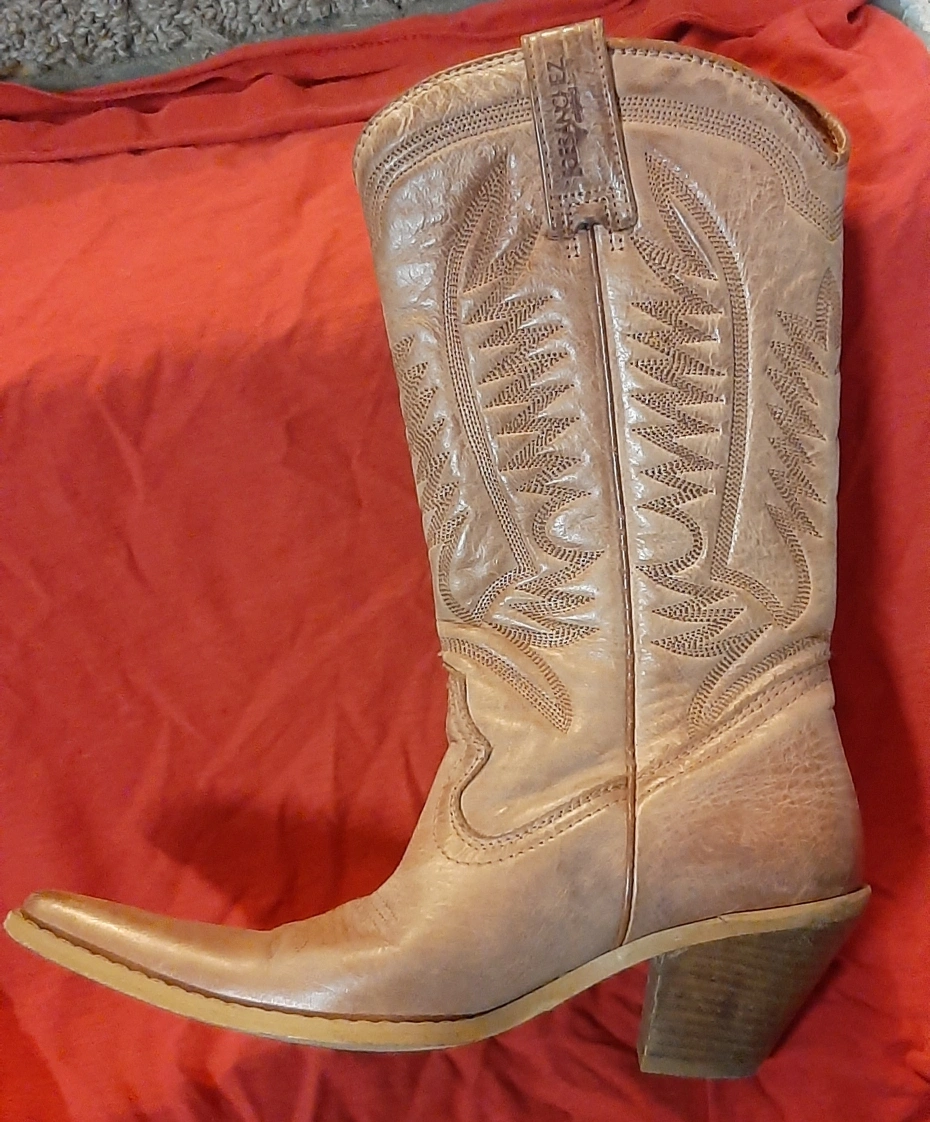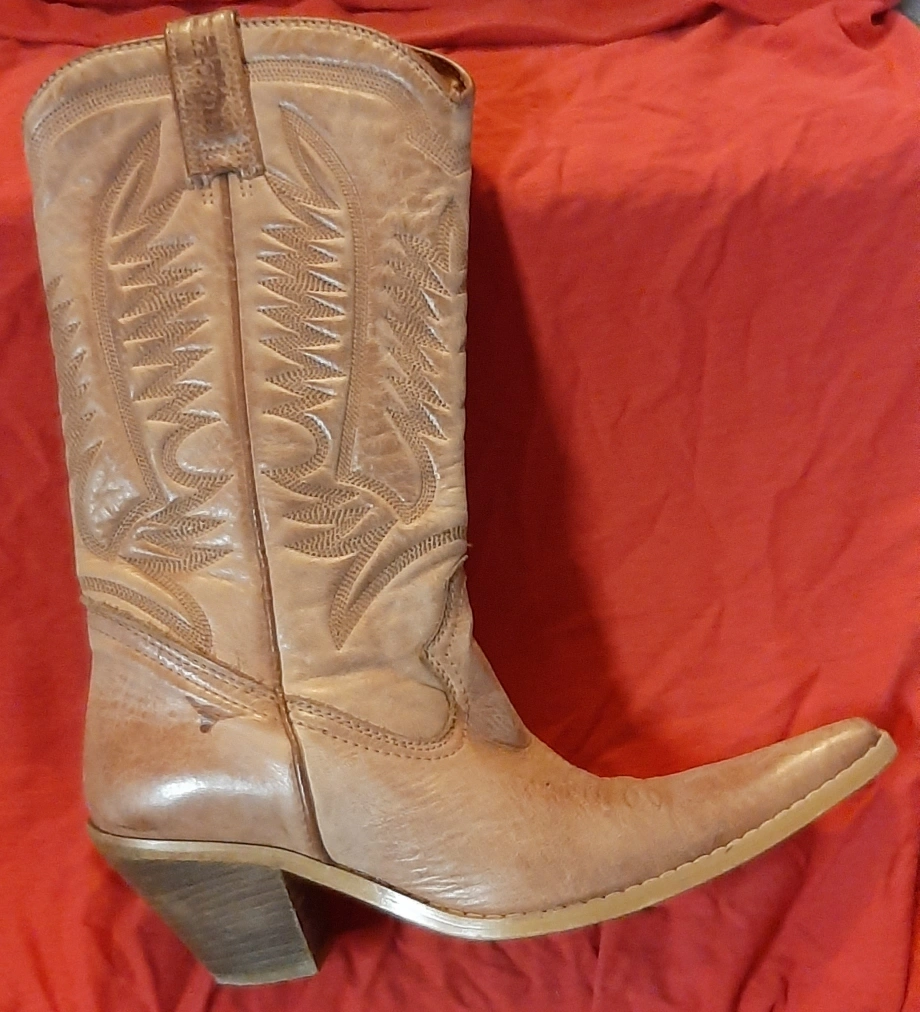 Joe Sanchez women's tan leather cowboy boots with a pointed toe and a wooden heel. The boots have a decorative stitching pattern on the shaft. The boots are in good condition. Size: 6