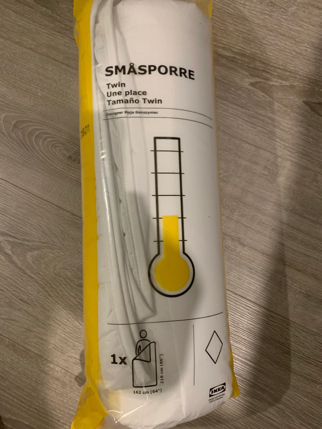 New in package twin size duvet, unopened. 162 cm x 218 cm. White. Made of polyester.