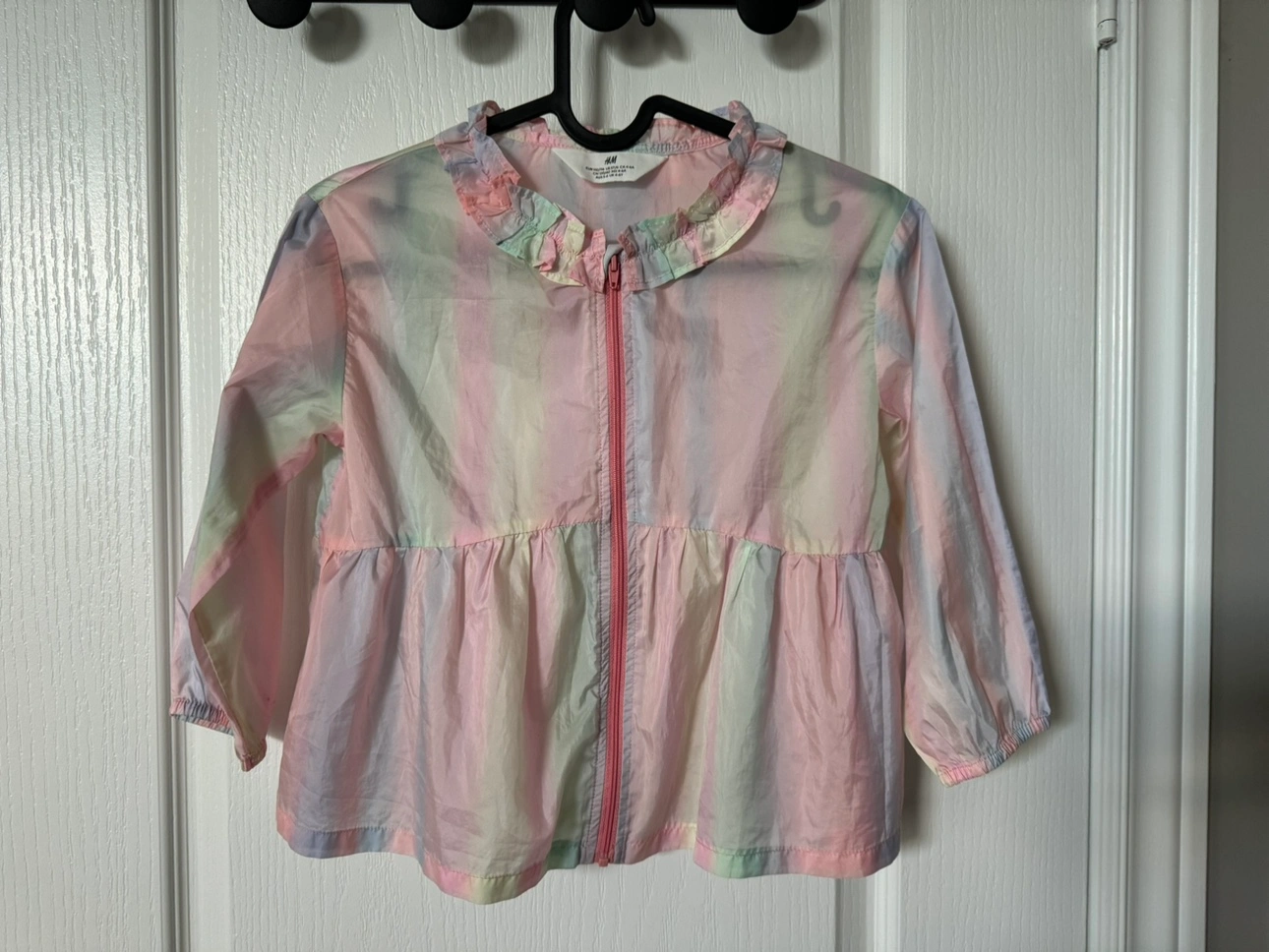 Rainbow tie dye printed jacket with ruffle collar and zipper closure.