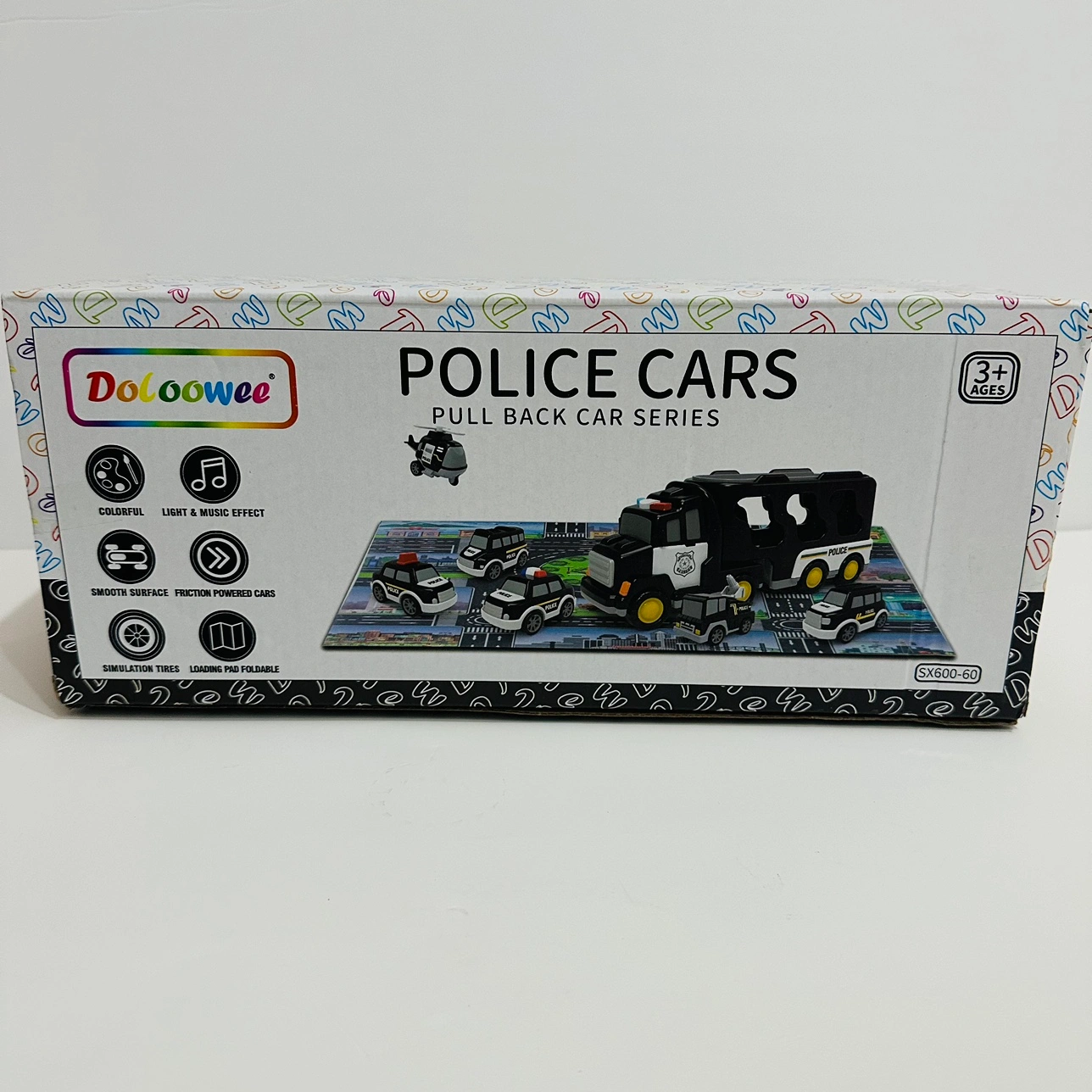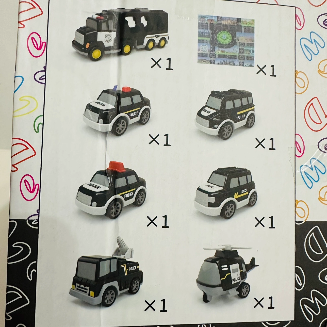 This toy set includes 6 police vehicles including a helicopter, a truck, and four cars. The toys are friction powered and feature light and music effects.