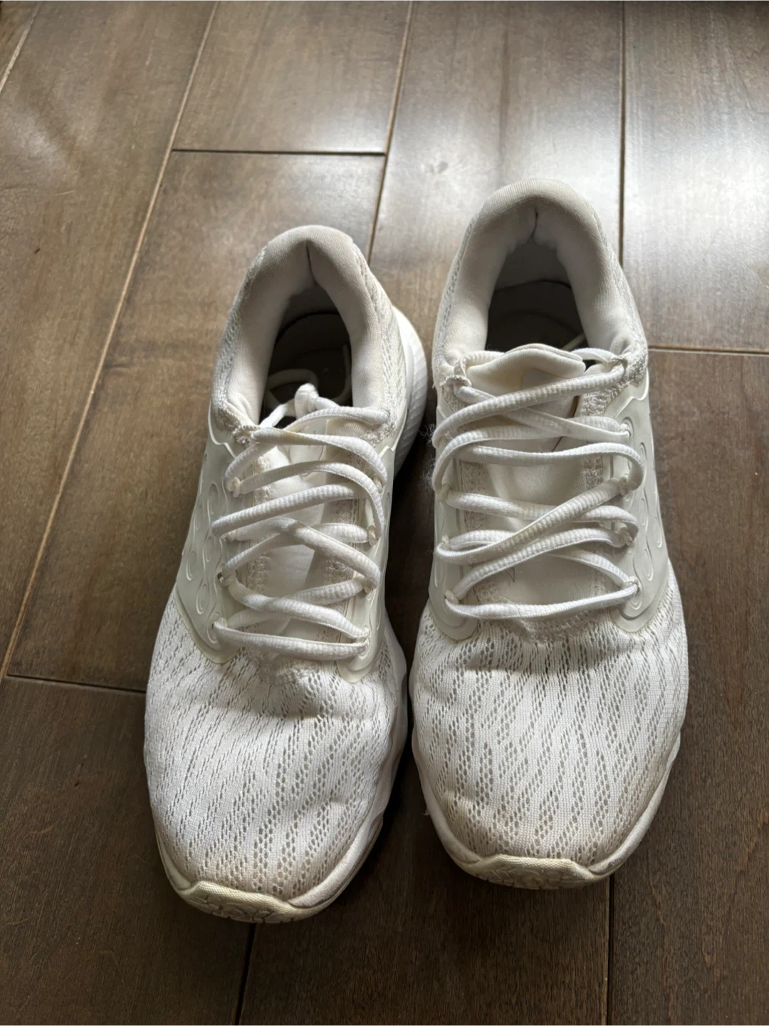 These are a pair of white Under Armour running shoes. They're made with a mesh upper and a durable rubber sole for good traction. These shoes are great for everyday wear or for hitting the gym!