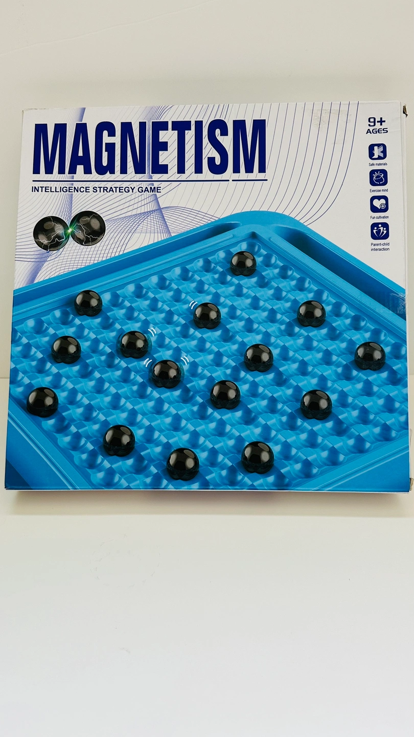 This is a magnetic strategy game with a blue board and black balls. The game comes with a board, balls, a spinner, and a bag to store the pieces.