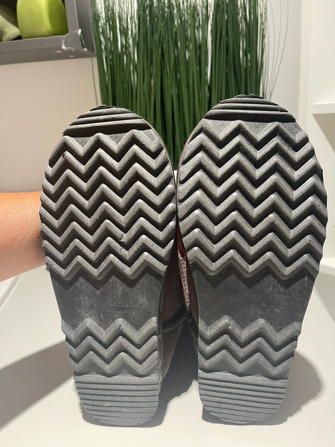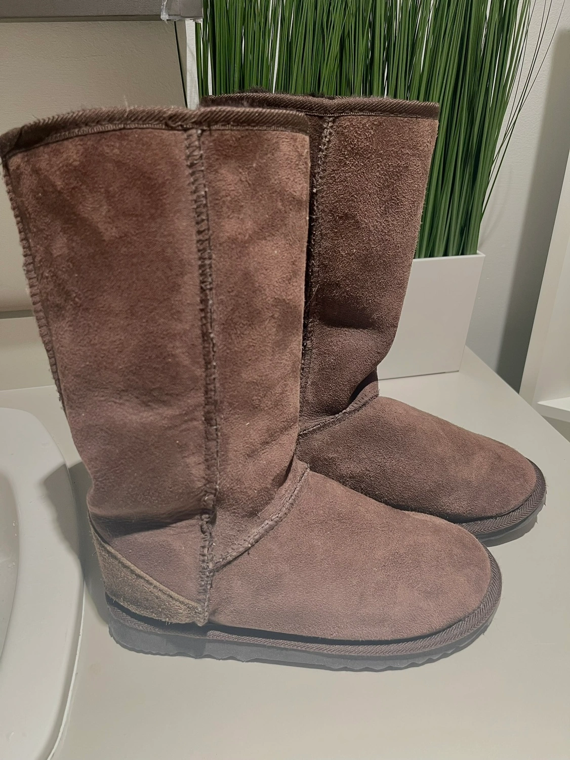 These are real tall UGG suede boots with full sheepskin lining and rubber sole. Lightly worn because daughter’s feet grew too fast. Size 6.