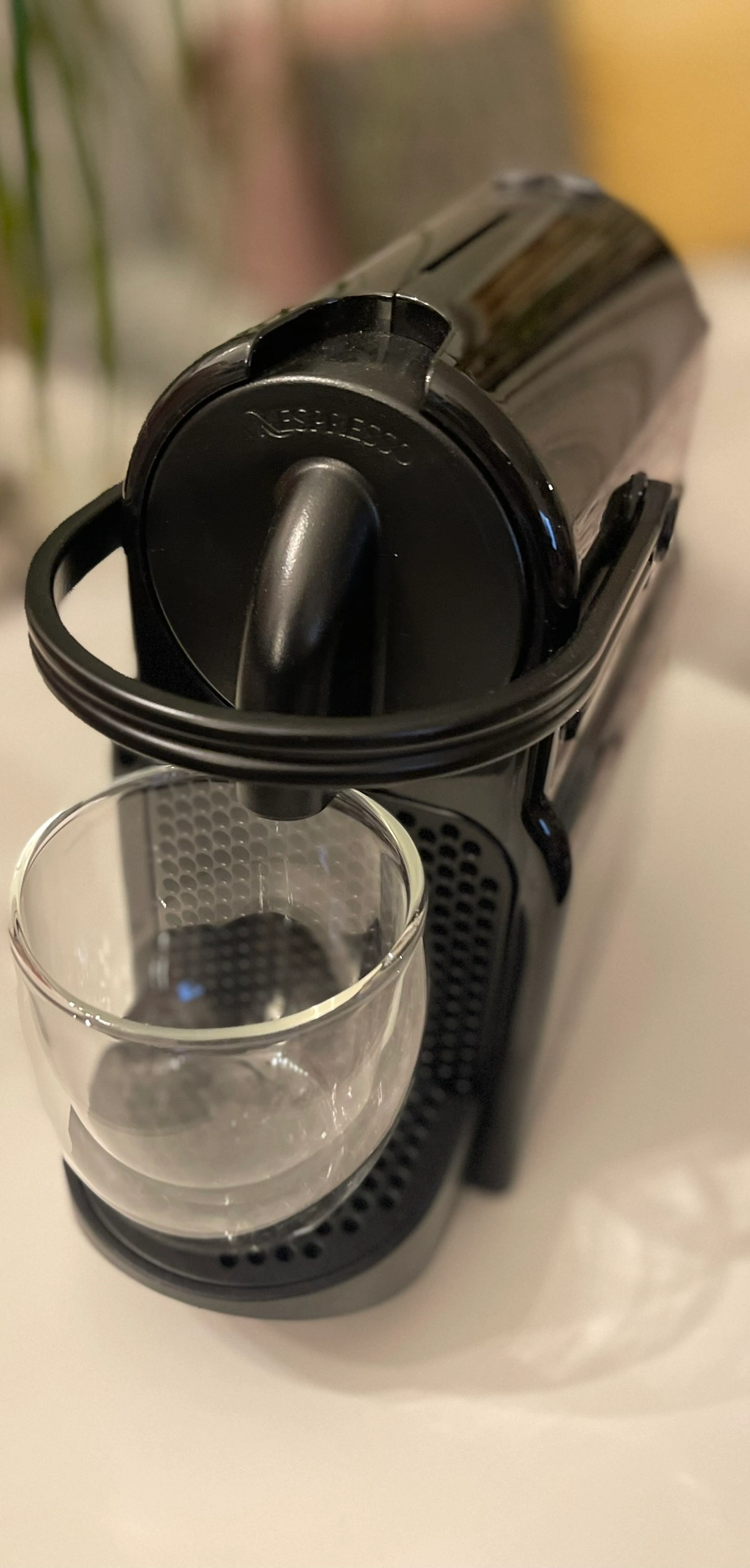 Black Nespresso Inissia coffee maker with one heat proof glass cup. In good working condition. Small pods. No longer needed like my ex!π