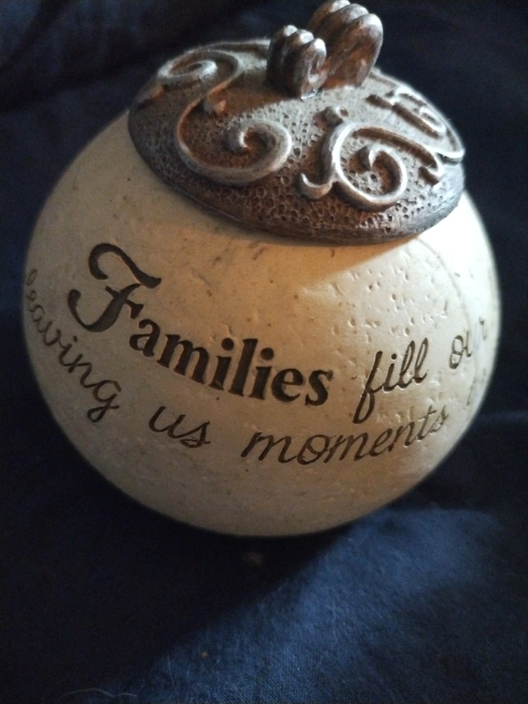 1000+White ceramic jar with a lid featuring a silver metal design. The jar reads "Families fill our lives with happiness and laughter leaving us moments to treasure today and forever after "❤️