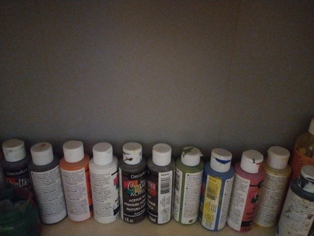 1000+A set of 12 acrylic paints in a variety of colours. The paints are in 4 oz bottles. used paints but a bunch of them still have a lot in them