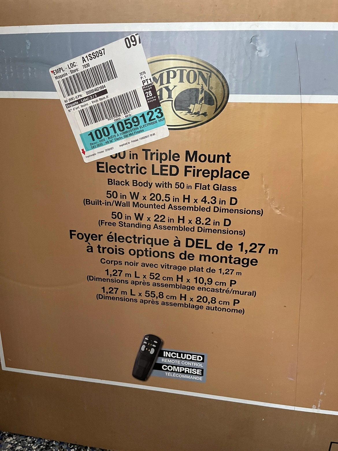 Hampton Bay Triple Mount Electric LED Fireplace -50x20.5x4.3”