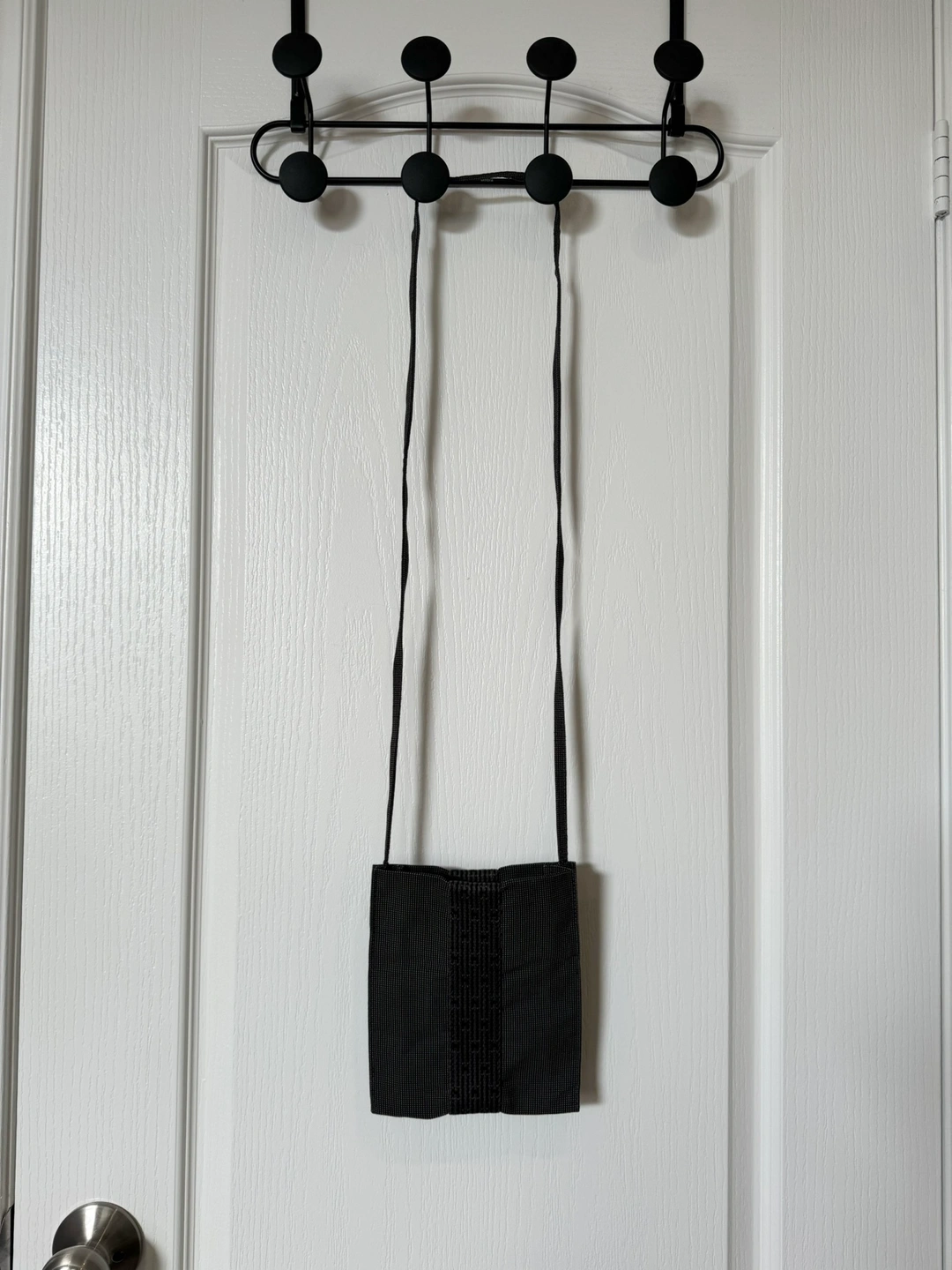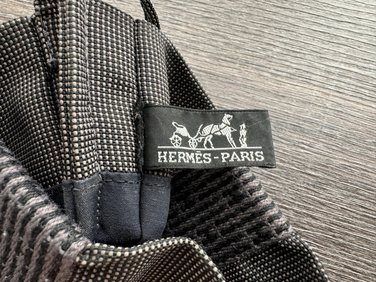A Hermés small grey crossbody bag with a thin strap and a small black woven tape design on the front.