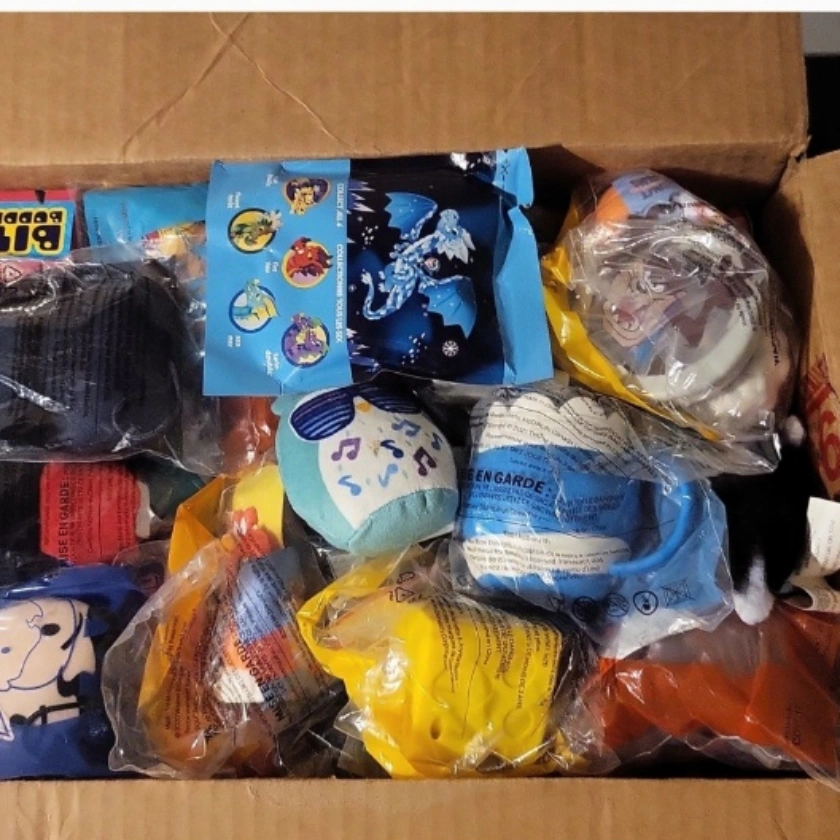 A collection of unopened McDonald's Happy Meal toys, featuring characters from various movies and TV shows. The toys are in their original packaging.