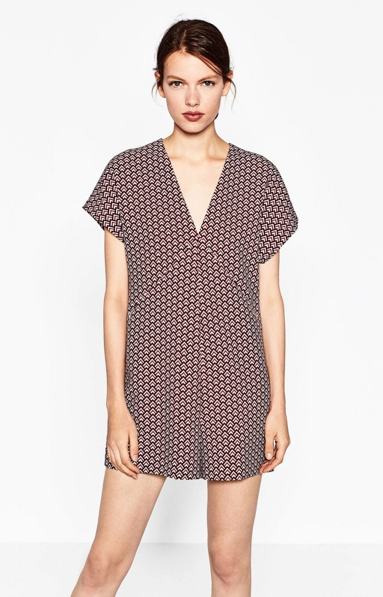 Red, black, and blue geometric print romper with a v-neckline and short sleeves. The romper has a relaxed fit and is perfect for a casual summer look.