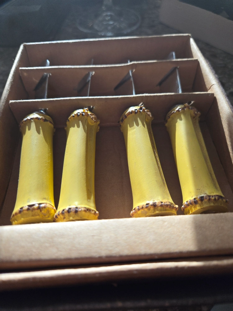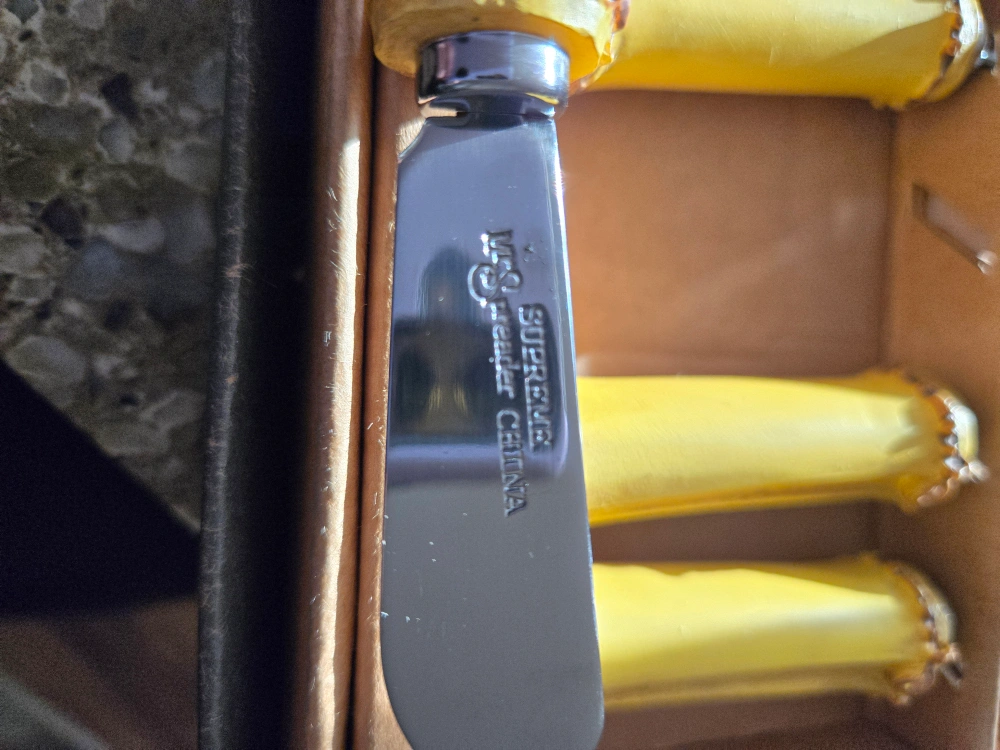 836Set of 4 butter knives with yellow bamboo-style handles. Made in China.